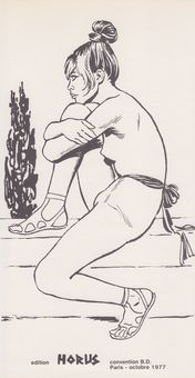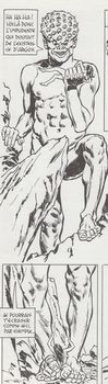 remarques: | édition Horus EO 1977 N&B 70 pages avec aquarelle cartonné (ex libris) de la Convention BD 1977 - un récit érotique sur fond de mythologie grecque - Epoxy, une jeune fille des îles grecques, est prise en otage par de drôles de pirates et soumise à Koltar, un sadiste mécanique (?), - Koltar sera foudroyé par les dieux et Epoxy s'échoue sur une plage déserte où elle sera cette fois capturée par les amazones de la reine Hyppolyte >> p. 6 une Epoxy bien en chair >> p. 8 des relations plutôt lesbiennes avec la reine des amazones - visite d'Heraklès et de Thésée, roi d'Attique chez les amazones, visite durant laquelle Epoxy est enlevée cette fois par Thésée qui l'abandonnera à son sort - par la suite, Epoxy sera récupérée par le centaure Fural, puis revendiquée par Chiron, le chef des centaures qui punira Fural pour l'avoir défié >> p. 25 Chiron, le fougueux centaure >> p. 28 la mort héroïque de Fural et >> p. 29 la mort d'un guerrier centaure tué par Epoxy qui peut se révéler redoutable - mais elle sera reprise et livrée au dieu Dionysos pour les festivités des anthestéries où Epoxy rencontre Dionysos, dieu des récoltes et des vendanges, Silène, père adoptif de Dionysos et dieu de l'ivresse, Pan et sa flûte, dieu des bergers ainsi que, Priape dieu de la virilité et enfin les Satyres >> p. 32 les anthestéries (fêtes des fleurs) - laissée pour compte, Epoxy s'accouple avec le Zeus, métamorphosé en l'occasion en un fringant taureau, mais ceux-ci n'échappent pas à l'attention de Héra qui fait enlever Epoxy par un aigle et la fait jeter dans la prison où Hera détient ses victimes gardées par Argos, le géant aux 100 yeux >> Epoxy y rencontre Io transformé en génisse, la nymphe Echo, les filles de Proteos et Antigone aux cheveux de serpents >> p. 39 Zeus métamorphosé en taureau >> p. 44 le gardien Argos - toutefois avec l'aide d'Hermès, le dieu des voleurs, Epoxy réussira à déjouer la surveillance d'Argos, - Hermès par la même occasion tue Argos et s'empare du casque d'invisibilité d'Hadès - par la suite Epoxy rencontre la jolie Psyché, tourmentée à cause de sa beauté par Aphrodite - Epoxy prend la place de Psyché et se retrouve confrontée avec Aphrodite, déesse de l'amour qui bientôt, lasse d'Epoxy, la confie à Eros, le dieu de l'amour qui la renvoie à Hermès qui dépose Epoxy dans le Tartare avec comme mission de rendre le casque d'invisibilité à Hadès >> p. 54 et 55 belles planches érotiques avec Aphrodite - grâce au casque d'invisibilité, Epoxy franchit les portes du Tartare sans être inquiétée par Perséphone, épouse d'Hadès et par le gardien, le chien Cerbère - Epoxy y rencontre le nautonier Charon, les Champs Elysés, le Tartare, le roi de Phrygie, les mégères Erinye, Tityos qui trahit Zeus, Ixion qui souilla l'honneur d'Hera, Eris la déesse de l'oubli et de la discorde, pour enfin arriver à l'aéropage d'Hadès à qui elle rend le casque d'invisibilité >> p. 60 à 63 quelques superbes planches - Hadès fait reconduire Epoxy au monde des vivants d'où Epoxy est sortie par erreur pour entrer dans un monde parallèle mythologique, - Epoxy sera recueillie et soignée par des spéléologues mais Epoxy désire retourner au monde parallèle et sera aspirée par une langue de feu provenant d'un volcan (peut'être allusion à Cuvelier qui à cette période traverse une crise dépressive) n.b. les propos d'Hermès à Epoxy en page 58: "la terre des humains n'est qu'un microcosme limité par ses quelques dimensions utilisables rien n'est plus simple, pour la contrôler, que de créer chez son habitant le besoin d'un surnaturel auquel il ne demande que se soumettre, il ne nous reste plus alors qu'à être ce surnaturel que l'on appelle dieu ou autre chose, pour nous c'est ridiculement facile, un simple jeu" ! >> un scénario assez bien imaginé avec un merveilleux graphisme mythologique et érotique de Cuvelier, une intromission ou vision dans le monde mythologique grec exprimant peut'être la propre libération de Cuvelier à la fin de l'album annexes - couverture de l'album - ex-libris joint à l'album - 4ème plat de l'album - la chute du centaure - le géant Argos aux cent yeux |