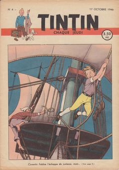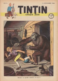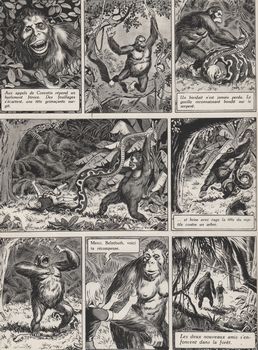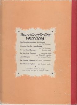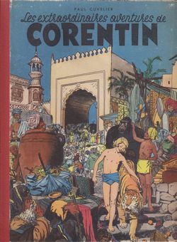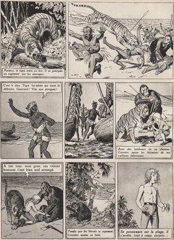 remarques: | - édition Van Cortenbergh 1950, dernier titre au 4ème plat: le voleur de Bagdad, N&B au lavis, 64 pages + 7 planches couleur hors texte, scénario en partie de Jacques Melkebeke (mais non mentionné dans l'album) - Ker-Armor, entre Quimper et Lorient, en 1775 Corentin Feldoë échappe à son oncle, ivrogne et brutal, pour s'embarquer clandestinement sur un brick en partance pour les mers du sud - il est découvert puis accepté comme second mousse sur le brick qui est attaqué un peu plus tard par des pirates, Corentin échappe aux pirates mais le brick fait naufrage lors d'une tempête durant laquelle Corentin est au prise avec un gorille dont il soignera une blessure - réfugié sur une île, Corentin est agressé par un boa mais sauvé par le gorille qu'il avait secouru, celui-ci devient son ami et est baptisé Belzébuth >> p. 10+11 la lutte contre le boa = 2 belles planches - avec Belzébuth, Corentin libère un tigre pris dans un piège >> p. 13 la leçon donné par Belzébuth au tigre - après quoi des sauvages débarquent sur l'île et capturent Corentin qui est libéré par ses deux nouveaux alliés: Belzebuth et le tigre baptisé Moloch >> p. 15/ 16 l'attaque de Belzébuth et Moloch - embarqués sur une pirogue abandonnée par les sauvages, Corentin et ses amis rejoignent le continent où Corentin fait la connaissance d'un nouvel ami: Kim le petit hindou qui l'amène chez ses parents dans la principauté de Minpore aux Indes - Corentin guérit la princesse Sa-Skya, fille du sultan, malade de nostalgie et Corentin est admis dans l'entourage du sultan, mais la princesse est enlevée par une secte hostile à son père - Corentin avec Kim réussira à délivrer la princesse >> p. 23 le mystère de la statue >> p. 25 étude anatomique (l'homme accroupi) >> p. 30 par Allah, vous ne l'aurez pas vivante - plus tard, un complot est ourdi contre le sultan par d'anciens proches du sultan, Sa-Skya et son père sont amenés en captivité dans la cité du désert, toutefois, le prince Imaël, un fidèle du sultan, parviendra à soustraire Kim et Corentin de l'emprise des rebelles >> p. 43 Corentin en poursuivant un rebelle est pris dans un incendie de brousse >> p. 45 le sauvetage de Corentin par Moloch qui est lui-même sauvé par Belzébuth! - Kim est enlevé par un mystérieux homme qui commande aux serpents, il s'avère qu'il est un prince, le prince Hagor, qui veut aussi lutter contre les rebelles >> p. 49 l'homme qui commande aux serpents - toute l'équipe se rend à la cité du désert et en route, grâce à ses serpents, le prince Hagor devient le chef d'une tribu de cannibales - la cité du désert est prise d'assaut, les grands prêtres sont capturés et leur chef, l'ancien médecin du sultan, trouve la mort en s'enfuyant, mais auparavant Corentin devra encore se battre contre une affreuse mégère >> p. 57/58 démêlés avec la vieille mégère - Corentin et Kim trouveront la paix et le bonheur à la cour du sultan >> des aventures vraiment extraordinaires avec toutefois un scénario au texte ordinaire pas très recherché (à noter: le langage petit nègre de Kim), mais de sublimes et merveilleuses illustrations dont les superbes planches en couleur HT, notamment >> p. 16A la confrontation avec le gorille >> p. 32A la parade aux éléphants >> p. 48A le rocher aux serpents >> p. 48B la chute de Corentin avec Belzébuth n.b. les aventures de Corentin paraissent pour la première fois dans le journal de Tintin belge no 1 du 26.9.1946 et devient vite une des séries phares du journal au côté d'Hergé, Jacobs et Laudy annexes - 1er et 4ème plat de l'album - deux couvertures du journal Tintin belge - deux illustrations tirées de l'album |