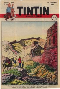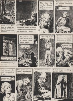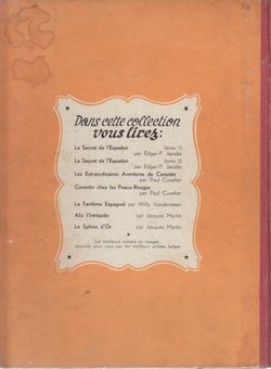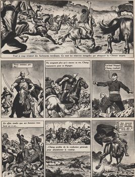 remarques: | édition Cortenbergh 1952, lavis N&B, 64 page y compris sept planches couleur HT, dernier titre: le sphinx d'or - chez le sultan de Minpore, la vie idéale est bien monotone pour Corentin qui décide avec Kim (mais sans Belzébuth et Moloch) de se rendre en Chine - Corentin reçoit du sultan une magnifique bague pour lui porter bonheur durant son voyage - le duo s'embarque sur un sampan avec un capitaine peu agréable et durant la traversée, Corentin rencontre Chang, un chinois, qui s'intéresse particulièrement à sa bague qui serait l'emblème en Chine de l'autorité du grand maître du dragon d'or >> p. 6 une belle planche avec la vignette 4 qui ressemble à un dragon - mais suite à une tempête, le bateau fait naufrage et Chang en profite pour s'emparer de la bague de Corentin et de s'enfuir - il s'avère que Chang est un chef de brigands qui font prisonniers Kim et Corentin, toutefois ceux-ci réussissent à s'évader et prennent la direction de Pékin - sur leur route, ils rencontrent un vieil ermite qui leur donne des conseils et leur révèle qu'il existe un trésor caché par le maître du dragon d'or, pour sa défense, Corentin reçoit aussi une épée redoutable - arrivé à Pékin Corentin reçoit quelque information du chef des bonzes sur le trésor qui serait caché dans la grande muraille de Chine et qu'il est sujet de pleurs à ce sujet >> p. 17/18 2 HT dont une magnifique sur un temple chinois - libéré de l'emprise magique de l'ermite, Chang gagne aussi Pékin et dénonce auprès de l'empereur de Chine les deux amis comme deux comploteurs - à la tête des soldats de l'empereur, Chang s'empare de la bague de Corentin et les amène prisonniers à la cour de l'empereur >> p. 18 à admirer: les armures chinoises - à la cour, Kim et Corentin sont défendus par le prince Song, mais celui-ci est aussi arrêté par Chang qui est maintenant le maître absolu grâce à la bague du maître du dragon d'or - fuite de nos trois amis qui après de nombreuses péripéties seront capturés à nouveau par Chang >> p. 33/34 deux planches HT pas très recherchées - les trois amis réussissent à nouveau à s'enfuir en prenant l'empereur comme otage, en route vers la Mongolie, l'empereur est relâché et nos amis vont à nouveau être rejoints par Chang et ses soldats lorsqu'un parti de mongols attaquent les chnois >> p. 40 étude de visages >> p. 46/47 combat entre mongols et chinois n.b. la vignette no 6 de la plage 47 a été remaniée par rapport à celle imprimée dans le Journal Tintin France no 44 du 25.8.1949 (un coup de revers de sabre au lieu que Chang décapite la tête) n.b. il faudrait plutôt lire à revers = par derrière - les troupes de Chang sont battues mais Chang, rescapé, continue la poursuite sans se faire voir >> p. 49/50 2 superbes planches HT sur la muraille de Chine - lors de la recherche du trésor, Corentin récupère sa bague dans un poisson pêché dans un lac environnant (celle-ci avait été jeté à l'eau lors d'un combat avec Chang) - après de nombreuses recherches le long de la grande muraille, nos amis arrivent au lieu dit de la brèche aux pleurs - grâce à la bague, un passage secret menant au trésor est découvert sans se douter que Chang est sur leurs traces - arrivé dans la salle au trésor, Chang intervient, mais durant le combat, il déclanche accidentellement un méchanisme qui cause une inondation dans la salle du trésor - le trésor est perdu mais provoque aussi la perte de Chang >> p. 58 à voir le visage haineux de Chang - mais selon le prince Song courage, loyauté et bonté sont les seuls vrais trésors et de retour à Pékin, l'empereur est détrôné et Song prend sa place avec la bague du maître du dragon d'or que Corentin lui a remise >> p. 65 dernière planche HT où Kim et Corentin retrouvent Moloch et Belzébuth au palais du sultan >> le scénario n'est toujours pas très recherché (**) et contient de nombreuses anomalies (faits anormaux ou peu crédibles), mais toujours un superbe graphisme, quoique qu'un peu moins marqué que dans l'album précédent ** dont à nouveau le langage "petit nègre" de Kim soit >> p. 15 Corentin, toi croire qu'on dira toi où est trésor annexes - 1er et 4ème plat de l'album - deux superbes couvertures parues dans le journal Tintin (1948 et 1949) - deux pages extraites de l'album >> à voir dans l'album couleur, la différence de présentation pour la 6ème vignette de la page 47 |