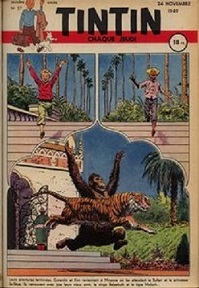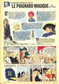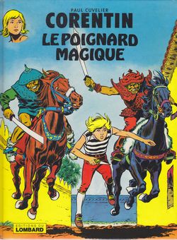 remarques: | - réédition de l'album Lombard 1963, 64 pages scénario de Greg (mais non mentionné dans l'album) et même couverture que l'édition originale - c'est la suite des nouvelles aventures de Corentin (se situant bien avant l'épisode de Corentin et les Peaux-Rouges) - alors que Corentin se repose chez le rajah de Sonpur (ce n'est plus le sultan de Minpore), un navire breton arrive à Sonpur avec le sire de Saint-Malo et le capitaine Van Put - Corentin est chargé par le rajah d'une mission à Nédérabad pour prendre livraison de 20 éléphants Corentin part avec Kim et Belzébuth mais sans Moloch (à noter que Kim ne parle plus "petit nègre"), ils sont accompagnés par le comte de St-Malo et de Van Put >> p. 6 deuxième vignette, un beau dessin bien connu - arrivée à Nédérabad, Corentin reçoit comme cadeau Paï, l'éléphant pour la princesse Sa-Skya et un poignard d'or, l'ancus, un poignard magique qui doit apporter bonheur au rajah de Sonpur (n.b. il semble qu'un ancus est aussi le nom du poignard utilisé par le cornac pour diriger son éléphant) >> p. 9 Paï le Mont-Blanc des tropiques - sur le trajet du retour, Corentin et Kim tombent sur des hommes primitifs dirigés par Imael (plutôt Hagor, une ancienne connaissance de Corentin et Kim) qui habitent au sommet des arbres >> p. 18 une récupération acrobatique - de retour à Sonpur, Corentin se fait dérober par le comte de Saint-Malo le poignard d'or, - le comte de St-Malo réembarqué pour la France, Corentin et Kim se mettent à sa poursuite, arrivée en Bretagne > p. 24 et vive le sol breton - Corentin retrouve son village natal de Ker-Armor, son oncle Joël est décédé, mais Corentin rencontre le curé de Ker-Armor et Turlurette, le simple d'esprit >> p. 28 Corentin et Kim qui font lit commun (lit clos) - lors de ses recherches et grâce à Turlurette, Corentin délivre le marquis de St-Guirrec emprisonné par St-Malo >> p. 32 à 34 3 pages de très mauvais graphisme (dessinées par Cuvelier?, en tout cas graphisme repris par Cuvelier dès la page 35) - Corentin récupère l'ancus et retourne aux Indes avec Kim, mais entretemps à Sonpur, le rajah a été détrôné par le cruel mongol Sardal Khan et attaqués par des pirates, - Corentin et Kim sont capturés et vendus comme esclaves, tous deux réussiront à s'échapper et avec Moloch et Belzébuth commence une guerre d'harcèlement contre les occupants mongols - grâce au poignard magique, Corentin réussira à rallier de nombreux partisans au rajah et avec l'aide des hommes primitifs d'Imael ainsi que des canons du navire de Van Put, Sardal Khan sera éliminé et le rajah ainsi que Sa-Skya délivrés de leur prison >> un scénario à multiples rebondissements qui reprennent quelque peu des épisodes du premier album, mais vraiment rien de très intéressant, - un graphisme également délaissé par Cuvelier qui traverse une crise de dépression, ce qui explique son désarroi lors de la reprise des aventures de Corentin après une longue pause sabbatique de Cuvelier annexes - couverture de l'album - couverture du journal Tintin 1949 - une page extraite du journal Tintin |