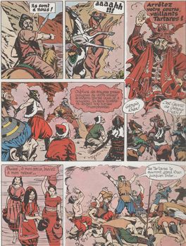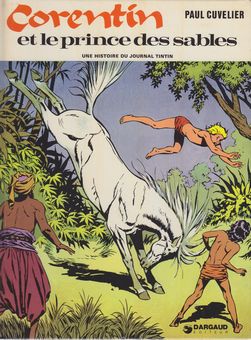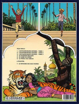 remarques: | - réédition mais 1ère édition cartonnée, couleur, 46 pages scénario Van Hamme mentionné sur la page de garde - toujours chez le rajah de Sompur, rencontre de Kim et Corentin dans la jungle avec Yldérim, un mystérieux chasseur et officier turc de la sublime porte dont la troupe de chasseurs ont capturé Belzebuth et Moloch - en voulant les délivrer, Corentin et Kim sont fait prisonniers, Corentin est condamné à mort alors que Kim est retenu prisonnier pour un but particulier >> p. 4/5 Kim pour la première fois sans son turban avec sa chevelure au vent - Corentin sera toutefois sauvé par Kaltourjian, le marchand d'esclaves qui vend Corentin sur le marché aux esclaves >> p. 15 Corentin est racheté par un mystérieux veillard qui paye le prix de Corentin en monnaie d'abeilles - le vieillard, un magicien, du nom de Narrédine, amène Corentin dans son repaire appelé les "crocs de Satan" = un oasis au milieu du désert protégé par des rochers abruptes - Narrédine demande à Corentin de l'aider à retrouver Zaïla, sa fille, qui a été enlevée par un groupe de tartares >> p. 22 les connaissances de Narrédine, son étude sur le nucléaire (les atomos) >> p. 23 la recherche des sciences et de la vérité par les livres, la vaste bibliothèque de Narrédine, le pouvoir des livres - à la recherche de Zaïla, Corentin rencontre le jeune arabe Khaleb qui devient son allié, Zaïla est délivrée et >> p. 31 les tartares sont mis hors d'état par la magie de Narrédine qui leur fait croire en la présence de Gengis Khan à qui ils obéissent aveuglement - Zaïla retrouve Narrédine, Khaleb conduit Corentin à sa ville d'Al-Amarah, la cité du prince des sables où pourrait se trouver Kim - Corentin retrouve Kim qui a été drogué et que Ylderim avec l'usurpateur Gamoul font passer pour le prince des sables, mais Corentin est fait prisonnier et est condamné à être décapité par Kim, le soi-disant prince des sables - in extremis, Corentin sera délivré par Khaleb, le vrai prince des sables, qui avec ses partisans chassent Ylderim et Gamoul du pouvoir - toutefois Kim est resté sous l'influence de la drogue et ne reconnait toujours plus Corentin - la suite dans l'album "le royaume des eaux noires" >> grâce à Van Hamme le scénario s'améliore nettement tout comme le graphisme de Cuvelier qui retrouve quelque peu sa vigueur d'antan - apparition du personange de Narrédine et de sa fille Zaïla qui ressemble beaucoup à Sa-Skya, Corentin commence lentement à devenir un adulte annexes - 1er et 4ème plat de l'album 1974 - page extraite de l'album - 4ème plat de l'album réédition de 1996 (la couverture restant la même) |