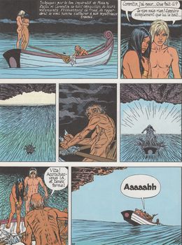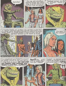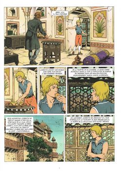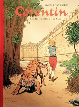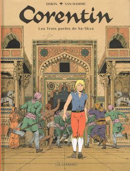 remarques: | édition originale 1974, 47 pages - le sage Narrédine, incapable de guérir Kim de sa torpeur, conseille à Corentin d'aller trouver le mage Hassan Midani dans les monts Pamir, - Corentin décide de partir seul sans Zaïla ni Belzébuth ni Moloch malgré les demandes pressantes de Zaïla qui veut l'accompagner >> p.5 7ème vignette, une belle planche du portrait de Corentin - mais sur son trajet, Corentin est capturé par des bédouins du désert et ne sera délivré que par l'intervention amplifiée de magie causée par Zaïla qui a quand même suivi Corentin emmenant avec elle Belzébuth et Moloch >> p. 13 à 15 les interventions magiques de Zaïla - le chef des bédouins informe nos amis que le mage Midani a été enlevé par le Chaïtan (Satan), dieu des hommes-lézards qui demeure dans les profondeurs du lac noir - tous deux poursuivent leur route et arrivent au Lac Noir, laissant les deux animaux sur la rive, ils partent sur une embarcation qui est prise dans des tourbillons - ils se retrouvent dans un monde souterrain et après avoir évité de nombreux pièges dont >> p. 22/23 la lutte contre les lézards géants - ils sont capturés par le Chaïtan >> p. 27 les explications du Chaïtan qui a l'intention de conquérir et dominer le monde après avoir éliminé Narrédine (sa fille en otage) et Midani qu'il détient déjà, explications aussi sur la magie blanche et la magie noire - toutefois Zaïla utilise à nouveau ses dons magiques et donne à Corentin le don d'invisibilité, ce qui permet à nos amis de s'enfuir en emmenant le mage Midani - ils sont poursuivis sur un lac souterrain qui se termine par la plus haute chute du monde, mais grâce au conseil du mage Midani, ils échappent à leurs poursuivants en confectionnant avec leurs habits un genre de parachute (vol delta) - ce qui leur permet de rejoindre la terre ferme sans trop de difficultées et de retrouver leurs amis Belzébuth et Moloch ainsi que leurs chevaux >> p. 36-38 des pages tout à fait érotiques - finalement ils seront débarrassés des hommes-lézards par la cavalerie du prince des sables arrivée à la rescousse et en joignant leur expérience, les deux savants réussiront à guérir Kim qui retrouvera son ami Corentin, tombé entretemps amoureux de Zaïla, mais qui doit abandonner celle-ci, car elle a décidé de se marier avec le prince de sables en laissant Corentin libre pour ses prochaines aventures dernière planche Kim demande à Corentin: pourquoi cet air songeur Corentin, n'est-tu pas heureux de rentrer? réponse de Corentin: oui Kim oui je suis heureux n.b. heureux peut'être mais triste, toutefois l'heureux bonhomme pourra se consoler en retrouvant sa chère Sa-Skya, mais c'est la fin des aventures de Corentin Feldoë, du moins du dernier cycle paru >> un scénario toujours bien imaginé par Van Hamme, bien que quelque fois un peu abracadabrant, mais c'est vraiment un des meilleurs albums de Corentin pour clôre son cycle, surtout de par le graphisme avec dans chaque page une étude de corps et de visages annexes - couverture de l'album EO - portrait de Corentin Feldoë - les deux fidèles compagnons de Corentin - deux pages extraites de l'album 1974 - 1er et 4ème plat de l'album 2016 - planche extraite de l'album 2016 (bien dessinée par Simon) - couverture du tirage de tête 2017 - couverture du 1er tome Lombard 1995 Information - un dernier album paraîtra toutefois en 2016 avec Van Hamme au scénario et Christophe Simon au graphisme, album intitulé: les trois perles de Sa-Skya, contenant 8 pages de bonus en fin d'album avec recherches graphiques, essai de couverture et illustrations - également dans le genre, une série Corentin d'après Cuvelier de trois volumes scénarisés par Jean Cheville et dessinés par Nadine Forster (rien à voir avec Hal Foster) >> tome 1 le départ de la destinée >> tome 2 danger à Messine >> tome 3 la colère de Zeus >> tome 4 prisonniers du Caire édités par Lombard Jeunesse, datés de 1995, série terminée en 1995 et non collectionnée ici |