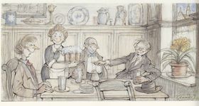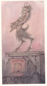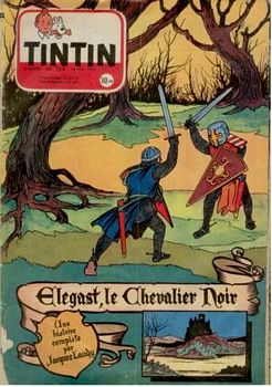 remarques: | - un royaume qui mêle le réel et l'imaginaire et où Laudy fait intervenir ses amis Melkebeke et Jacobs, mais où il romp vers 1960 avec Hergé qui est peut'être un peu jaloux de l'art comme pratiqué par Laudy - Laudy est un passionné de l'Ecosse où il se rend chaque année en vacances, c'est aussi un restaurateur de cornemuse - il dessinera plusieurs épisodes écossais: Rob Roy, David Balfour et la mission du major Redstone 1/ once upon a time au royaume des Bornys - 1604, l'histoire de Kasper Böse (le méchant Gaspard) qui s'engage dans l'armée de l'archiduc Albert à Ostende, il deviendra vite Rittmeister sous le nom de Borny >> p. 7 sa devise: Koninck will ick niet, Borny blijv ick" (ne veut pas devenir roi, Borny veut rester) - par la suite, à la tête d'une bande de mutins, Borny s'installe à la "Vosseslag" (la butte au renard) sur la commune de la "Heide" (la Lande) entre le lieu dit "de Haan" (le coq) et celui de Klemskerke - il y fait la connaissance du meunier Jacobsen et ensemble ils ouvrent une auberge - au XXème siècle, le village de Heide s'est bien développé, histoire du pugilat entre l'épouse fidèle d'un notable et la volage Zwarte Lola, l'affaire échoua dans les mains de Jakske (l'auteur de ce récit) >> p. 17 l'histoire de Jakske - l'autre Jakske, un peu reluisant phénomène, devient le chef d'une bande de garnements que l'on surnomma les "verdomte droevoarts" qui s'enquiquinèrent avec la bande de Bimelabomelatumeleke et sa soeur Chibichke - ils inventèrent une boisson explosive: la "ramonache" = une bière bien forte - rencontre avec Hassan et Kaddour ainsi que la princesse Zéboïde qui est enlevée par les trois sorcières jalouses: >> p. 22 Schele Hex, Bolunghe Spuuk et Dulle Nette - mais grâce au bon petit génie Snorri, on retrouvera la trace de Zobéïde enfermée à Otterbeek (le ruisseau aux loutres) 2/ au temps des grandes espérances - 1923, rencontre du trio Menneke (peintre), Van Melkebeke (rédacteur et écrivain) ainsi que Jacobs (dessinateur) surnommé le rossignol du Maelbeek (de part sa passion pour l'opéra) >> p. 32 le trio à table - critique des éditeurs (Lapinte et Durapiat) à qui Jacobs doit remettre ses travaux sans retard (sa table à dessin étant son chevalet de torture) - entretemps Jacobs entend parler d'un trésor et part à sa recherche, il découvre effectivement un coffre rempli de pierres précieuses - Edgar, nouveau Monte-Cristo, s'émancipe alors de ses éditeurs-rapaces et commence une vie épanouie, il charme par la même occasion la diva moscovite Tenia Spiralova - il s'occupe aussi de restaurer et de développer son quartier natal d'Otterbeek - il sauve la vie de Pumpernickel, le roi des papillons, qui en gratitude lui octroie l'ordre de la Farfalla, ce qui permet à Jacobs de porter un noeud papillon véritable - enfin on découvre le lieu où est séquestrée la pauvre Zobéïde et une expédition est organisée pour la libérer >> p. 58 Hassan retrouve sa Zéboïde mais les sorcières ne veulent pas abandonner leur proie, alors Pumpernickel leur envoie un bataillon de mites, teignes et autres éléments douteux dirigés par le capitaine dégénéré Messoucy du Berry - vaincues, les sorcières s'enfuient en Ecosse pour participer à un synode dans les landes écossaises 3/ au cimetière de Gray Friars - elles sont poursuivies par nos amis dont le génie Snorri demande l'aide de ses frères dolmen, cromlech et autres menhirs qui repèrent les sorcières au cimetière de Gray Friars près d'Edinbourgh >> p. 71 la boutique des "glen bagpipe makers" - le révérend Cathcart se joint à la troupe >> p. 72 le dialecte écossais du révérend: "guid nicht and may the chance follow yer steps" - les sorcières sont définitivement éliminées malgré l'intervention du violon manié par le diable Old Nick 4/ au royaume d'Edgar - où il n'y avait que des êtres d'exception, Jacobs y créa le "salon des génies complets" et les talents d'artiste furent développés dans tout ce petit peuple - puis Jacobs donna une fiesta fantastique et un bal masqué, lui-même apparaissant dans le costume de l'un de ses héros favoris le maréchal de cavalerie Murat - il y trouve aussi la piccola Rosaura di Venezie >> p. 89 la rencontre avec Rosaura - mais patatras, tout cela n'était qu'un rêve et Jacobs se réveille en jurant de ne plus boire autant de "bloempanch" - il retrouve malheureusement aussi ses éditeurs rapaces qui lui promettent de lui serrer dorénavant encore plus la vis! >> p. 93 le dessin de cul-de-lampe qui clot cet album (= ornement placé en bas d'une page de fin de chapitre ou de livre) >> un conte merveilleux à la Laudy, mi-réel, mi-imaginaire, hommage à ses deux amis, Melkebeke et Jacobs, mais aussi à la culture et à la langue flamande - l'album est surtout intéressant de par les magnifiques illustrations en aquarelle qu'il contient n.b. Laudy décède en 1993 quelques mois après la parution de cet album annexes - couverture de l'album - deux illustrations de l'album - couverture journal Tintin 1952 pour une histoire complète signée Laudy |