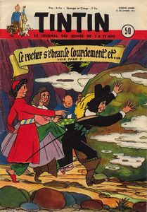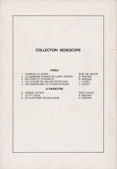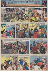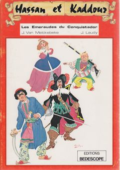 remarques: | - série parue dans le journal Tintin du no 171 à 201 (1952) 32 planches avec deux couvertures du Journal Tintin scénario en collaboration avec J. Van Melkebeke voir aussi dossier 462KL (Laudy) et 464E (Hassan et Kaddour) (sous études BD, >> étude BD après encyclo) - nos deux amis à Bagdad sont mélancoliques, retrouvaille avec Tromboni déguisé maintenant en magicien oriental (du nom de Bouzraël) qui cette fois les fait transporter au XVIIème siècle sur un galion espagnol voguant vers San Bimbo où les deux compères rencontrent le noble Sosthène de la Véranda et sa nièce Cunégonde - Sosthène les prend sous sa protection pour pouvoir percer le secret de leur mystérieuse et subite apparition >> p. 3 Cunégonde plus gracieuse que la pleine lune (Kaddour dixit) - pris dans une tempête, le quatuor s'échoue sur une plage inconnue où ils sont agressés par des indiens caraïbes >> p. 6 Hassan prend connaissance d'un message écrit par Sosthène "le cornet sonne, le poisson nage, la cloche tinte, la coupe se vide dans la bouche du dieu" - débarrassés des sauvages, ils sont capturés par des pirates, puis par les soldats du gouverneur Rodriguez de San Bimbo >> p. 11 devant Rodriguez, les méthodes personnelles de Cunégonde n'arrangent pas les choses, mais ils seront inopinément délivrés lorsqu'une flotte de pirates bombarde la cité >> p. 14 San Bimbo mise à feu et à sang, nos amis s'enfuient dans la jungle >> p. 16 les explications de Sosthène concernant le trésor de Cortez = cinq énormes émeraudes - capturés par les indiens aztèques, nos amis sont conduits au temple du dieu Vitzilopuchtli pour y être sacrifiés >> p. 19 la statue du dieu - mais en utilisant ses talents de ventriloque, Kaddour fait parler la statue qui ordonne à ses sujets de laisser tranquille les 4 étrangers, puis Kaddour trouve dans la bouche du dieu les 5 émeraudes - de retour en Espagne au château de la Veranda, Hassan et Kaddour découvrent que Cunégonde est en fait une traîtresse et travaille pour Babylas, le frère jumeau fourbe de Sosthène - Babylas se débarrasse de Sosthène et se substitue à lui, mais lui et Cunégonde ne savent pas où Sosthène a caché les émeraudes et finalement par hasard, ils les découvrent dans le chapeau de Sosthène - les deux frères s'étant entretués, Cunégonde s'empare des émeraudes, poursuivie par Hassan et Kaddour, Cunégonde tombe dans une oubliette, toutefois Hassan et Kaddour réussissent à attraper les émeraudes au vol, mais ils tombent à leur tour dans une oubliette et ne seront sauvés que par l'intervention de Tromboni qui les renvoie à Bagdad avec les émeraudes sans que ni Hassan ni Kaddour ne se souviennent d'où proviennent ces émeraudes >> un scénario plutôt passionnant mais surtout à nouveau de superbes illustrations avec très bon coloriage; à noter que Kaddour est dans cet épisode moins ballourd que d''habitude n.b. cette bande a fait l'objet d'une édition par Bedescope (1978) mais uniquement en version N&B, ce qui à nouveau enlève tout le charme du graphisme couleur annexes - 1er et 4ème plat de l'album Bedescope N&B 1978 - couverture originale journal Tintin no 50 (1951) - planche couleur du journal Tintin |