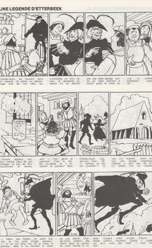 remarques: | titre complet: histoire comique de Charles-Quint et autres contes édition Jonas 1979, N&B, avec jaquette, tirage limité à 500 exemplaires, cet ouvrage portant le no 311 - biographie de Jacques Laudy (la biographie de Laudy n'a d'ailleurs jamais fait l'objet d'un cahier de la BD par les éditions Glénat) curieux pour un dessinateur de ce talent! - Jacques Laudy est l'un des "grands" de la BD belge - dès 1940, il réalise la couverture du premier numéro du journal Bravo, l'un des plus prestigieux journeaux de la BD franco-belge - c'est dans ce même journal qu'il réalisera ses premières bandes dessinées: ce sont Bimelabom et sa soeur Chibiche (1942) qui vivra 3 épisodes, puis Gust, le flibustier (1947) histoire mémorable où l'auteur se met lui-même en scène - en 1946, il fait partie de l'équipe de base du journal Tintin qui est composée de: Cuvelier (avec Corentin), d'Hergé (avec son célèbre Tintin), de son ami d'enfance E.-P. Jacobs (avec le prestigieux Blake et Mortimer) et de lui-même (avec les quatre fils Aymont) - il allait donner à la BD belge une réputation mondiale - outre "les 4 fils Aymont" (1946), Laudy produisit Rob Roy (1947) n.b. mais uniquement dans Tintin belge, les aventures d'Hassan & Kaddour (7 épisodes à ce jour) mais aussi et surtout le fabuleux David Balfour (1952) dont l'emploi jusque là inusité de la technique à l'aquarelle fait de cette histoire l'une des oeuvres les plus remarquables de la BD franco-belge - cette édition de l'histoire comique de Charles Quint et autres contes nous fait découvrir l'un des aspects les plus caractéristiques de la production de Jacques Laudy: toute tournée vers le folklore, elle en tire l'essentiel de sa sagesse et de sa bonne humeur _ le présent volume réunit l'ensemble des légendes adaptées et illustrées par Jacques Laudy pour le périodique "petits belges" entre 1953 et 1958 - vingt d'entre elles sont consacrées à Charles Quint, cet empereur, que la tradition a transformé en héros, est aussi connu en Flandre que son compère Thyl Uilenspiegel dès le 17ème siècle, nous trouvons des recueils, écrits en flamand, qui relatent ses exploits quel est donc cet empereur Charles affublé des titres les plus prestigieux: roi des Romains et empereur d'Allemagne, duc de Bourgogne et roi d'Espagne, roi des Deux-Siciles et de Sardaigne, prince souverain des Pays-Bas et caetera, car la liste en serait fastidieuse tant elle est inépuisable - le plus glorieux de tous sans doute peut être cité à titre d'exemple: unique empereur des Deux-Mondes; ces deux mondes (l'ancien et le nouveau) faisaient de l'Atlantique sa mer intérieure de telle sorte qu'il pouvait dire, non sans fierté, que jamais sur son empire le soleil devait se coucher - quel est-il donc ce Charles qui, si l'on en croit le chevalier Marchal relatant le fait dans sa brillante "histoire politique du règne de l'empereur Charles-Quint (Tarlier éditeur Bruxelles 1856) naquit "dans un cabinet d'aisances" (ce qui est on ne peut plus original pour un futur empereur), puis plus tard, à la fin de son règne, qui se paya le luxe d'assister à son propre enterrement ricanant dans sa barbe de voir la mine dépitée des nobles courtisans obligés de jouer cette macabre comédie? - Charles V de Habsbourg est né en Belgique à Gand en l'an 1500 (élevé par des précepteurs nationaux, entouré de ministres et de capitaines nationaux) - il aimait profondément son peuple et fut assez proche de celui-ci qui le lui rendit bien puisqu'il l'immortalisa dans la légende - fut-il goinfre et laid? c'est vrai, mais la sagesse populaire n'en eut cure et perpétua sa légende, mêlant faits historiques et récits controuvés, par delà les siècles (controuver = inventer mensongèrement) - dès lors, quoi d'étonnant de trouver au bout de cette course une nouvelle adaptation en bande dessinée - la seconde partie du volume, designée sous la lapidaire formule "d'autres contes" est constituée d'une suite de légendes toutes racontées en une page, légendes bien d'origine belge: - bruxelloises comme "la légende de Notre-Dame du Sablon", - flamandes comme celle des "Maneblussers de Malines" ou - wallonnes comme celle de la "légende du Doudou" du beau pays de Wasmes - légendes qui font partie du peuple belge, car toutes ont été entendues ou lues durant leur enfance, elles sont un univers, un monde où chacun retrouvera un petit peu de sa jeunesse, amusantes, instructives ou moralisatrices (même religieuses), ces petites historiettes feront plus que nous distraire, elles nous feront rêver 1/ légendes de Charles Quint (p. 3 à 22) dont une légende d'Etterbeek, Charles-Quint et le savetier, la souris, la journée des "balais", le plus fou le premier, un royal porte-lanterne, le choix d'une enseigne n.b. écoutète = prévôt = traduction française du terme allemand "Schultheiss" (traduction littérale = celui qui prononce un jugement), Schult, en latin scultetus, dérivé du mot Schuld - l'écoutète s'occupe généralement de "basse justice" alors que la haute justice est confié au "Vogt" (avoué, bailli, intendant) qui exerçait une protection militaire ou la justice séculière (Blutgericht) dans un certain territoire d'où Landvogt - moutier (ou Münster en allemand) désigne une commune, c'est aussi le synonyme ancien de monastère (St-Pierre-le-Moutier) en latin ministerium ou monasterium >> p. 26 l'origine d'Anvers ou Antwerpen, mot qui provient d'un pirate qui coupait la main droite de ses victimes et les jetaient dans l'Escaut d'où "hand werpen" 2/ autres contes dont - une légende de St-Géry, le prieuré de Groenendael, Sainte-Ursule, - la légende de Damme en Flandre, - la légende de la houille découvert par le maréchal-ferrant Hullos, - les Kiekefretters (mangeurs de poulets), - la légende du Doudou, les Maanblussers de Malines (éteigneurs de lune), - Nickel, le cheval de l'empereur Napoleon et la légende du Pumpernickel, 