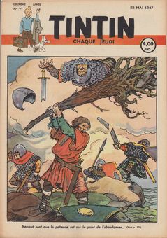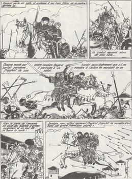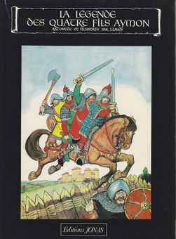 remarques: | album cartonné, avec jaquette, 58 pages, N&B, tirage limité à 500 exemplaires dont celui-ci porte le no 259, l'album contient 8 pages HT en couleur 1/ note sur Jacques Laudy - J. Laudy, né le 7.4.1907, mort en 1993, était en pleine gloire (même si celle-ci fut courte) pendant la période du journal Tintin (1946-1960), - débuts dans "Bravo" avec des histoires poétiques et fantastiques, après sa collaboration à "ABC", "grand coeur", "le petit monde", etc il collabora aux éditions Lombard et fit partie du premier noyau de dessinateurs du journal Tintin où, à côté de l'humour et l'héroïsme d'Hergé, de l'exotisme de Cuvelier, l'hyperréalisme et la science-fiction de Jacobs, il représentait le genre épique et romantique - délaissé par son éditeur, Laudy abandonne la bande dessinée après avoir créé chef-d'oeuvre après chef-d'oeuvre parmi lesquels les "quatre fils Aymon" qui fut négligé par l'éditeur et parut en partie dans des teintes bichromes, ce qui ne facilitait pas la lecture - le résultat fut plus heureux quand l'histoire parut dans "Ons Volske" en noir&blanc, cette première bande dessinée historique fut suivie par "Rob Roy", "David Balfour" et d'autres bandes plus courtes parmi lesquelles "Karel ende Elegast" (paru en HC dans le journal Tintin) - les "quatre fils Aymon" est aussi bien du point de vue de l'histoire que de l'expression picturale, un chef-d'oeuvre qu'on ne pouvait refuser aux lecteurs 2/ notes sur les 4 fils Aymon - quant à Dendermonde (Flandre occidentale) a lieu l'ommeganck (= cortège folklorique), le cheval Bayard en est le point culminant - les wallons aussi se réclament de la légende puisqu'à Dinant, le long de la Meuse, on montre le rocher duquel le cheval a pris son élan pour sauter au-dessus de la Meuse - l'histoire des quatre fils Aymon est basée sur un roman de chevalerie datant du XII et XIIIème siècle, mieux connu sous le nom de "Renaud de Montalban", inspiré peut'être d'un modèle français - cette histoire fait partie d'une suite de romans francs qui tirent leur substance de l'histoire nationale des Mérovingiens et des Carolingiens - ils étaient écrits par des trouvères pendant que les jongleurs et les ménestrels, accompagnés au luth, les récitaient - le personnage central de ces romans est Charlemagne qui règna de 768 à 814 - les romans les plus connus sont "Karel ende Elegast" dont Laudy tira une histoire courte - dans "Renaud de Montauban", Charlemagne n'est pas représenté comme un prince bon et droit, mais ce sont au contraire ses adversaires les plus farouches, les 4 fils Aymon qui apparaissent comme les véritables héros de ce récit - cette oeuvre reste un des romans de chevalerie les plus passionnants, même si parfois, on en a tiré des versions mutilées,destinées aux enfants - heureusement, ce ne fut pas le cas pour l'adaptation qu'en fit J. Laudy, parue dans le journal Tintin (belge uniquement) du no 1 (26.9.1946) au no 42 (16.10.1947) et qui reste une des plus belles perles à sa couronne déjà bien chargée 3/ le roman - très populaire au Moyen-Age, la légende relate l'histoire des quatre fils du duc Aymon: Renaud, Allard, Richard et Guichard qui font partie de la cour de Charlemagne, mais à la suite d'une dispute, Renaud blesse mortellement Bertolais, le neveu de Charlemagne dont un messager est aussi assassiné par le comte de Beuves, frère du père des 4 fils Aymon - ceux-ci sont obligés de quitter la cour et se réfugient dans la mystérieuse forêt d'Ardennes, aidés par leur cousin Maugis, un mage célèbre genre Merlin l'enchanteur - toujours poursuivis par les sbires de Charlemagne (dont le grand Roland, préfet des Marches, neveu de Charlemagne et Ogier l'Ardennais qui cherchera toutefois à protéger les quatre frères Aymon), tous les quatre sur le cheval magique Bayard franchissent la Meuse d'un bond immense - la colère de Charlemagne ne s'apaisera qu'avec le sacrifice du cheval Bayard - lors de leur fuite, les 4 fils Aymon iront aider le roi Yon à repousser les sarrasins qui envahissent l'Aquitaine, en gratitude Renaud et ses frères vont recevoir un territoire où ils construiront le fameux château de Montauban - Renaud épousera Clarisse, fille du roi Yon et il en aura deux garçons: Aymonet et Yonnet qu'on retrouvera plus tard auprès de l'empereur Charlemagne - le blason des Aymon était: "de sable, semé d'étoiles d'or, au lion de même lampassé de gueules brochant" - la légende dit aussi qu'un Aymon était grand maître des chevaliers du Temple n.b. saint Beowulf ou Beowulph - le Beowulf est un poème épique majeur de la littérature anglo-saxonne (vers VII et IXème siècle) - le poème est inspiré de la tradition orale anglo-saxonne et retranscrit une épopée germanique en vers, contant les exploits du héros Beowulf qui donna son nom au poème, sur lesquels viennent se greffer des ajouts chrétien (d'où les saints Beowulph et Ingulph mentionnés dans le récit BD) 4/ le récit BD - le duc Aymon et ses 4 fils: Renaud, Allard, Guichard et Richard >> p. 5 tous les quatre fortement membrés vivent dans la forêt ardennaise au temps de Charlemagne, - tombés dans la disgrâce de celui-ci, ils doivent se réfugier dans la forêt profonde des Ardennes - ils y reçoivent le cheval magique Bayard de la part du cousin Maugis, protecteur de Renaud - ils sont assiégés par les troupes de Charlemagne dans leur château de Montfort, mais réussissent à s'échapper grâce au cheval Bayard qui bondit en un saut immense au-dessus de la Meuse - ils partent alors en croisade contre les sarrasins au côté du roi Yon en Aquitaine où Renaud marie Clarisse, soeur du roi Yon de Gascogne, - Renaud reçoit des territoires et y bâtit le célèbre château de Montauban - l'ayant appris, Charlemagne tend un piège à Renaud qui devra faire allégeance à Charlemagne, - il est condamné à faire pénitence en se rendant comme ermite en Terre Sainte alors que le c