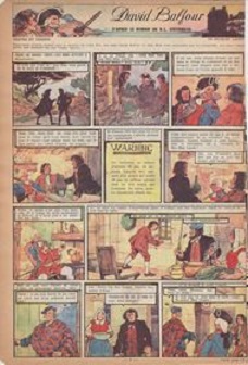 remarques: | David Balfour, récit adapté du roman "kidnapped" by R.-L. Stevenson, album broché, 37 pages, couleur, graphisme genre aquarelle n.b. enlevé! (titre original: kidnapped or the lad with the silver button), également paru sous le titre: les aventures de David Balfour, est un roman d'aventures de Robert Louis Stevenson publié en 1886, en France, il a été édité pour la première fois en 1905 - Ecosse, 1751, l'histoire de David Balfour qui part d'Edinbourg à la mort de son père pour prendre possession de son héritage détenu par son oncle Ebenezer Balfour, un vieil avare, qui ne veut pas se séparer du château de son frère >> p. 4 Ebenezer, le personnage le plus avare de la bande dessinée, pour se débarrasser de David, cet héritier malencontreux le fait kidnapper par un capitaine de voilier peu scrupuleux et voici David Balfour embarqué dans une aventure maritime qui devrait le conduire vers des pays lointains d'où il ne reviendra peut'être jamais, du moins c'est l'avis de son oncle Ebenezer - mais à bord du voilier, David fait la connaissance d'Alan Breck Stewart, un partisan jacobite, qui veut être débarqué secrètement sur la côte des Highlands, David devient son ami et Alan obtient de débarquer sur l'île de Skye avec David >> p. 12 le débarquement sur l'île de Skye - pérégrination de David et Alan dans le pays des Highlanders où ils rencontreront une foule de gens plus ou moins amicaux - d'abord l'adversaire d'Alan: - Colin Roy, le renard rouge, laird des Campbells, allié aux anglais, qui se fera mystérieusement assassiné par un rebelle et dont le crime sera mis sur le compte d'Alan et de David - James des Glens, partisan jacobite - Cluny Mac Pherson, laird des Vourich, ami d'Alan - Robin Olg Mac Gregor, laird des Mac Gregor, adversaire d'Alan - Duncan Dhu Mac Laren, laird des Mac Laren, ami d'Alan ainsi que des habits rouges et Whigs, collet-monté n.b. sous Louis XIII, les collets montés étaient de grands cols que les femmes portaient, quand la mode passa, seules les plus âgées en portaient encore or, bien souvent, celles-ci étaient très traditionalistes il semblerait donc que l’on utilise ce terme pour définir des choses largement passées de mode - après avoir contacté avec David ses partisans et échappé aux patrouilles d'habits rouges, Alan repartira et David pourra enfin avec l'aide du notaire Rankeillor confondre son oncle Ebenazer et récupérer son bien >> p. 33 le duel à la cornemuse (bagpipe) entre Alan et Robin Mac Gregor - laird = lord en Ecosse, dirk = petit poignard écossais, - usquaebach = whisky = the word “uisge beatha”, meaning “water of life”, is popular Gaelic vernacular which refers to distilled spirits, pronounced “oos-ke-bah”, it is where we get our English word, “whisky” (first name of whisky) >> le récit est assez fidèle au roman mais l'album est surtout intéressant de par son graphisme genre aquarelle avec de superbes couleurs, toutefois le graphisme n'atteint pas la perfection des pages imprimées dans le journal Tintin annexes - couverture de l'album broché - un epage extraite de l'album - couverture journal Tintin no 1 (1948) - affiche du film kidnapped by Walt Disney (1960) |
