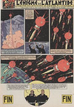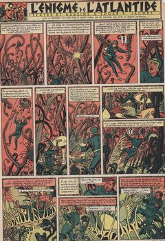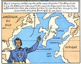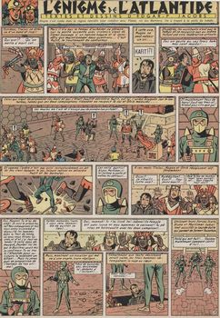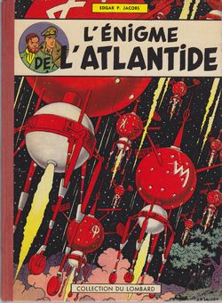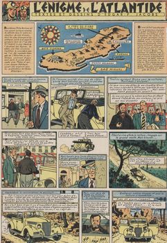 remarques: | - édition Lombard, imprimerie Bullens, EO 1957 édition belge, 64 pages, recartonnage, 4ème plat aux damiers couleur verte, dernier titre le puit 32, pages de garde Atlante avec point d'interrogation n.b. recartonnage = intérieurs d'album reliés dans d'anciens cartonnages, dits de récupération, restés en stock chez l'imprimeur - à noter les trois premières pages, un prélude qui se détache quelque peu du récit avec l'apparition terrestre d'un atlante habillé quelque peu différemment de ceux habitant le monde souterrain; d'ailleurs l'histoire avait été prévue en deux tomes par Jacobs, mais la rédaction du journal Tintin ne voulait pas d'un récit interminable par Jacobs et insista pour limiter la trame du récit à un seul tome - l'action débute dans l'archipel des Açores, sur l'île de Saô Miguel, ville de Furnas à O Foro do Diabo = le trou du diable où Mortimer aurait fait une découverte intéressante, Saô Miguel pourrait être une partie élevée de l'Atlantide, le continent disparu selon Platon >> p. 4 le coup de la panne au sucre >> p. 5 l'apparition mystérieuse (une soucoupe volante atlante) >> p. 6 le schéma pour la progression dans le trou du diable - apparition d'Olrik employé maintenant par une puissance étrangère avec son complice Ostrog, ceux-ci s'intéressent à une pierre mystérieuse ressemblant à l'orichalque que Mortimer aurait découvert - expédition au Foro da Diabo de Mortimer, Blake, le chef des guides Pépé et le faux guide Luis (en fait Olrik déguisé) - après une progression difficile, le trio arrive dans >> p. 9 la caverne au lac vert - suite à un orage, des vapeurs sulfureuses (caldeiras do inferno) envahissent les souterrains, Olrik se démasque et abandonne Blake et Mortimer à leur sort, mais en retournant sur ses pas, Olrik ne retrouve plus son chemin et tombe dans une faille béante, alors que Blake et Mortimer cherchent leur salut en entrant dans un tunnel inconnu au bout du lac vert - voyage au centre de la terre, mais finalement les deux hommes tombent sur des traces laissées par des humains et découvrent par la même occasion d'immenses gisements d'orichalque, mais attaqués par des ptérodactyles, ils sont sauvés par les atlantes de Poseidopolis où nos deux amis reprennent connaissance, rencontre avec: - le Basileus, empereur de l'Atlantide - le prince Icare, neveu du basileus et aerostratège de la flotte aérienne atlante (les fameuses soucoupes volantes et autres appareils) - le capitaine Magon, phulacontarque = chef de la garde qui est déjà hostile envers Blake et Mortimer - Icare prend les deux terriens sous sa protection et leur explique les origines de l'Atlantide avec l'orichalque comme source d'énergie - l'Atlantide est devenu un continent souterrain après avoir été détruit en surface par des catastrophes naturelles >> p. 21 la cité de Poseidopolis et la carte de l'Atlantide n.b. avec mention de l'Amérique du sud à la place de l'Amérique du nord - mais déjà des intrigues se nouent à la cour de l'empereur et Icare avec Blake et Mortimer sont visés par des attentats, notamment par des planos (hommes volants qui se déplacent grâce à un engin de vol sur leur dos et curieusement ceux-ci portent un masque) - Icare explique à ses amis l'existence d'un peuple barbare avec leur roi Tlalac, ennemis héréditaires des atlantes, mais qui ont été repoussés aux limites de l'empire atlante; - suite au comportement étrange de Magon et de son lieutenant Kafir, Icare décide d'effectuer une expédition en zone secrète, en zone barbare au-delà de la grande porte >> p. 26 le message de Tlalac adressé à Magon >> p. 28 le salut atlante, semblable au salut nazi? - lors de l'expédition secrète, le trio découvre un complot contre le gouvernement atlante par un groupe de rebelles sous le commandement dirigé par Magon, allié aux barbares - Icare et ses 2 amis réussissent à infiltrer les troupes de Magon mais découverts, ils doivent prendre la fuite pour avertir la cité atlante >> p. 36 le pont souterrain sur l'abîme (similaire à celui de l'espadon) >> p. 37 la pyramide pré-colombienne où se rencontrent les barbares de Tlalac avec les troupes de Magon et ce pays des barbares est encore plus aride que celui des atlantes même page: des flèches contre des armes atomiques - réapparition aussi d'Olrik, devenu le conseiller de Tlalac - fuite périlleuse de nos trois amis à travers des défilés, Blake se sépare d'Icare et de Mortimer, retardés dans leur progression, et traverse le pont avec le mot de passe "missi baka", il rejoint une mer intérieure et s'empare d'un hydroglisseur, mais perturbé par une tempête, il est rejeté sur le rivage et capturé, alors que Mortimer et Icare se fraillent un passage dans une dangereuse forêt paleozoïque >> p. 42 une sacré clé anglaise >> p. 44/45 les dangers de la forêt paleozoïque - finalement nos amis se retrouveront au défilé de la Flèche où se trouve une ancienne forteresse avec un gong sacré qui faisait office d'avertissement sonore se répercutant jusqu'à la capitale lors des anciennes invasions barbares - Mortimer réussit à faire sonner le gong et les trois amis s'enfuient à bord d'un sphéros (engin volant) >> p. 50 la danse folklorique des barbares avant les combats en l'honneur de leur dieu Hurakan - nos amis arrivent à Poseidopolis au moment où les premiers combats font rage entre forces loyales, rebelles et barbares pour éviter au Basileus d'être capturé par Magon, Tlalac et Olrik à la tête des barbares - arrivés au poste de commandement, Icare fait >> p. 59 fonctionner le feu du ciel, mais durant les combats, le poste de commandement qui contrôle les vannes du gigantesque barrage protégeant Poseidopolis est détruit - l'Atlantide est alors destinée à disparaître - le Basileus met alors en branle l'organisation d'émigration que les atlantes avaient déjà préparé pour un exode sur une autre planète