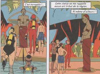 remarques: | - édition originale mars 2008, 56 pages pourrait s'intituler: Mortimer en Afrique - lac Ngorongoro, Tanganyka où le prof. Heidegang découvre une grotte avec une civilisation inconnue et met la main sur une bague mystérieuse, puis perd la raison - Mortimer, en convalescence depuis son aventure des sarcophages, retrouve Nastasia qui a fait l'analyse d'une roche ramenée par Mortimer lors de son expédition sur le 6ème continent, roche qui attesterait d'une très ancienne civilisation et Mortimer décide d'entreprendre une expédition >> p. 8 dinner au Centaur Club, mais cette fois sans Pomerol ni Saint-Emilion 1947 >> p. 11 au domicile de Mortimer, les bons services de la fée Benson et Mortimer qui confond un gin avec un scotch whisky, le tout dans l'ombre de l'espadon qui plane accroché au mur - rencontre avec Sarah Summertown, le premier amour de Mortimer, qui lui demande de faire partie de l'expédition tout comme Nastasia d'ailleurs >> p. 18 la théorie de la dérive des continents il y a 300 mio d'années quand l'Amérique du Sud, l'Afrique, les Indes et l'Antarctique ne faisaient qu'un seul continent appelé le Gondwana et selon la roche découverte par Mortimer, >> p. 21 il y aurait déjà eu des hommes avant l'ère des dinosaures >> information sur le Gondwana le Gondwana est un supercontinent formé tout à la fin du Néoprotérozoïque (– 600 millions d'années) et qui a commencé à se fracturer au Jurassique (– 160 millions d'années) - on distingue le Gondwana du Paléozoïque (appelé aussi Protogondwana) et celui du Mésozoïque, entre les deux, le Gondwana a fait partie du supercontinent Pangée. - il a été nommé par Eduard Suess d'après le nom d'une région de l'Inde du nord, Gondwâna (du sanskrit gondavana, forêt des Gonds), où ont été décrites les séquences sédimentaires du Permien-Trias de cet ancien continent - Eduard Suess orthographie originellement ce terme Gondwána-Land dans son livre le visage de la Terre (der Antlitz der Erde), édité entre 1883 et 1901 - alors que Blake reçoit la visite d'un mystérieux inconnu (un certain Mr. Bowler qui ne serait autre que le prof. Mortimer dans le corps d'Olrik mais on ne le sait pas encore) - ce curieux personnage, après une sérieuse discussion avec Blake, obtient de pouvoir rejoindre incognito l'équipe du prof Mortimer à Nairobi >> p. 19 une apparition qui ressemble de beaucoup à celle de la marque jaune >> p. 25 rencontre à l'hôpital avec Heidegang, bien malade, avec qui Mortimer (alias Olrik) parle pour la première fois en langue allemande >> p. 31 le pseudo Olrik rencontre son ancienne complice: le bezendjas et redevient le "chef" - la chasse continue avec un ballon volant pour Olrik et ses complices ainsi que d'autre part en admirant les animaux sauvages par Mortimer (éléphants, hippopotames, lion, lycaons, etc - finalement en plongeant dans la caverne du lac Namawi, que Heidegang avait découvert par marée basse, le quatuor (Mortimer, Nastasia, Summertown et leur guide masai) arrivent dans le sanctuaire de Gondwana, le sanctuaire de la vie >> p. 47 les explications du sanctuaire de la vie (en forme de T), - une civilisation qui a existé il y a 300 mio d'années, mais qui s'est auto-détruite, ce qui a causé un cataclysme d'où la dérive des continents - toutefois un groupe d'élite de cette première génération avait préparé une couveuse pour recréer une nouvelle race humaine plus tard et garantir ainsi la survie de l'espèce, la vie en T prévoit aussi que l'actuelle génération va aussi s'auto-détruire et pour cela renvoit les visiteurs au bord du lac Namawi en effacant de leur mémoire tout ce que les visiteurs avaient enregistré dans le monde secret du T >> la fin de l'histoire est un peu fantasmagorique, mais assez bien imaginée, Mortimer étant Olrik et Olrik étant Mortimer suite à un changement de corps opéré dans l'aventure précédente par le prince-savant Açoka avec son invention des cerveaux (esprits) séparés - sous l'identité de Bowler, Mortimer-Olrik a contacté Blake et a pu le convaincre (grâce à l'écriture qui vient de l'esprit et non du corps de Mortimer) - il lui alors soumis un plan pour pouvoir récupérer son véritable corps, dans le sanctuaire, la vérité éclate et il s'en suit une bagarre générale, mais le mystérieux T y met fin après avoir constaté que la folie des hommes n'avait pas changé - il n'instruira pas encore le monde actuel des nouvelles sciences qu'il possède, car celui-ci n'est pas encore en position pour recevoir de nouvelles sciences - il fait alors retourner tout ce monde à la surface après avoir oblitéré de leurs mémoires tout ce qu'ils viennent d'apprendre et les sarcophages ayant été préservés et amenés par Blake, avec l'aide du Subglacior II de Labrousse et du flying yacht du milliardaire Archibald Auchentoshan >> p. 52 à 56 chaque esprit rejoint son corps respectif puis Olrik et le bezendjas retournent en prison et les sarcophages seront définitivement détruits en les jetant dans la mer >> une histoire qui avait pourtant bien commencé, mais qui s'enlise quelque peu vers la fin, surtout avec les séquences de safari et de retour dans les sarcophages, malgré la présence des figures féminines des Miss Summertown et Nastasia - le graphisme par contre reste respectable annexes - couverture de l'album EO - l'emblème de la première génération "vie T" - l'arrivée des plongeurs devant la statue du roi des hommes-lycaons - le départ des visiteurs - la grande couveuse - deux couvertures réédition pour bibliophiles - cartes de l'ancien Gondwana - emblème de la royauté Gondwana 14ème siècle Information - l'action se passe en 1958, comme pour le précédent opus, les sarcophages du 6ème continent, c'est même l'exacte suite chronologique au point qu'il s'agit en fait, compte tenu des événements qui y sont relatés, du tome 3 des sarcophages du 6eme continent - l'album comporte 