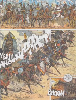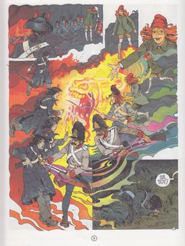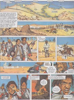 remarques: | 1798, le Directoire, la France est ravagée par des brigands appelés les chauffeurs (voir info) Morvan, en vadrouille, sauve la vie d'une aristocrate, la baronne Hortense, à l'auberge de Trouchu, Morvan a perdu Capucine et est toujours à la recherche de Jacquelin, surnommé La Fouine recueilli par la baronne, Morvan fait la connaissane d'un cercle de royalistes appelés les collets noirs qui cherchent à assassiner le général Bonaparte, surnommé le boucher, à cet effet ils engagent un executeur qui n'est autre que la Fouine, ce qui n'est pas du goût de Morvan, mais après avoir exécuté son coup, les collets noirs acceptent de livrer la Fouine à la vengeance de Morvan >> p. 25 la réunion des collets noirs n.b. les collets noirs sont un club secret monarchiste fictif qui conspire contre le gouvernement, c'est aussi le titre d'un roman par Fortuné du Boisgobey (1821-1891), il est l'auteur de plusieurs romans historiques et policiers retrouvaille imprévue avec Capucine chez la baronne >> p. 39 gloire et respect pour Bonaparte par un de ses grognards qui le protège personnellement le 9.5.1798, la flotte de Bonaparte prend le large et c'est l'aventure égyptienne qui commence pour Morvan accompagné de son ami Nicolas la Giberne, Morvan pourchasse toujours La Fouine dont il apprend que celui-ci se trouve aussi sur le navire l'Orient >> p. 45 la vengeance de Capucine sur la baronne Morvan se retrouve en pleine guerre >> p. 47 la charge des mameluks >> p. 50 mort de La Fouine tué par un mameluk >> p. 52 Morvan fera partie du régiment des dromadaires les fils de l'Aigle = les soldats de Bonaparte >> un scénario plutôt intéressant et un graphisme bien effectué par Faure Information les chauffeurs de pâturons (en argot = brûleurs de pieds ou simplement chauffeurs) est un terme populaire utilisé pour désigner les bandes de criminels qui s’introduisaient la nuit chez les gens et leur brûlaient les pieds sur les braises de la cheminée pour leur faire avouer où ils cachaient leurs économies |