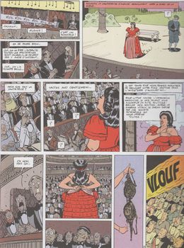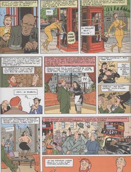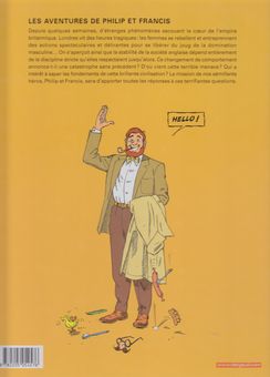 remarques: | album EO mai 2005, 56 pages scénario Pierre Veys, dessin Nicolas Barral - deux gentlemen anglais, Philip, scientifique, inventeur du célèbre espadon et Francis, membre du MI5 doivent enquêter dans Londres sur le terrible phénomène qui rend les femmes indépendantes et totalement incontrôlables - l’empire est en danger et tout sera fait pour rétablir l’ordre et les anglaises doivent absolument retrouver ce comportement b bienveillant envers les hommes et la nation, ce qui fait la force de l'empire - Pierre Veys et Nicolas Barral, déjà coupables de Baker Street, s’attaquent à un nouveau mythe britannique et dynamitent avec brio la bande dessinée franco-belge - parodier Blake et Mortimer n'est pas à la portée de tout le monde et n'est pas sans risque, l'exercice pouvant vite se transformer en potacherie sans intérêt ou en caricature grossière - toutefois lorsque ce sont de véritables admirateurs de l'œuvre de Jacobs qui s'y collent, on peut espérer que leur amour pour les personnages et leur sens critique (voire caustique lorsqu'il s'agit de Veys et Barral) peut aboutir à un résultat répondant aux attentes - et qu'attend-on d'une telle parodie? qu'elle nous fasse rire bien sûr mais surtout qu'elle revisite les codes de la série originale et les démonte en les tournant en ridicule sans tomber dans le grotesque - Mortimer en obsédé sexuel et gourmand patenté, Blake en macho et éternel enfant et Olrik en méchant raté, c'est certes assez similaire à ce que nous proposent les auteurs dans Baker Street - quelques longueurs apparaissent au fil de l'album, principalement lors de répétitions de gags, mais l'ensemble fournit largement son quota de rires et de sourires et les nombreux clins d'œil au monde de la bd (Tintin, Buck Danny) ou à la société anglaise, enrichissent le récit et font de menaces sur l'empire une parodie assez amusante - 99bis Park Lane, la routine anglaise - Mortimer fait une cure pour maigrir sous la surveillance de Nasir alors que Blake s'entraîne à l'escrime à 66ter espadon street - réunion d'urgence au MI5, d'abominables phénomènes se produisent à Londres où les anglaise ont perdu leur self-control >> p. 14 les cerveaux encéphales comparés par degré de qualité: homme, femme, singe, français >> p. 15 la centrale thermoélectrique de Battersea, actuellement désaffecté >> p. 18 apparition d'Olrik et de Sharkey qui ont capturé un agent de MI5 qui aime la couture et les rideaux bien faits - alors que Mortimer fait des recherches sur le "women's riot" après avoir changé de voiture et de garde-robe (un costard à carreaux), l'inspecteur-chef Kendall est chargé de les seconder >> p. 23 l'équation à 7 inconnues pour expliquer le women's riot - puis c'est la conférence au sommet avec Winston Churchill et son perroquet (Razul = cousin de Nasir) >> p. 28 référence à la marque jaune collée au dos de Blake (marque jaune = macho = mâle = mulet) >> p. 29 l'apparition de la marque jaune à Park Lane, mais c'est Mortimer déguisé qui veut s'infiltrer dans la cuisine pour casser la croûte à l'insu de Nasir >> p. 32/33 la scène de l'opéra où la cantatrice brûle son soutien-gorge devant son audience - alors que la femme de lord Swordfish (espadon) s'empare d'un camion de pompiers et sème la pagaille à Buckingham Palace - puis une poursuite dans une fête foraine avec séance de trapèze en porte-jarretelles, Mortimer découvre enfin le centre des phénomènes: c'est la Tour de la Mort en pleine zone paroxystique (de paroxysme = plus haut degré d'un phénomène) - on y découvre Olrik qui a inventé le télérevoltoscope, appareil qui contrôle le caractère des femmes - après avoir délivré Mortimer et Blake qui subit un traitement efféminé (avec épilation à la cire), la police intervient et neutralise Olrik qui réussit bien sûr à disparaître comme d'habitude >> p. 53 Brigitte Bordot = portrait de la femme la plus dévergondée qui prisonnière servait de modèle à Olrik! - les choses se remettent en place, les femmes rentrent dans l'ordre établi et l'empire est sauvé, mais Mortimer bénéficiera encore de l'aide de miss Bordot qui lui doit la vie >>> un premier volume d'une série sarcastique, parodie mais aussi satire de l'Angleterre avec bien sûr les français comme froggy men, plusieurs références aux aventures de Blake et Mortimer se référant surtout à la marque jaune annexes - 1er et 4ème plat de l'album - deux illustrations tirées de l'album |