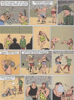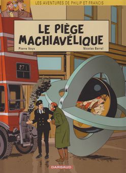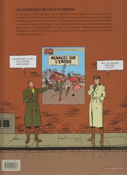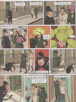 remarques: | second volume de la série, redémarrage du 2ème volume après 6 ans (2005) - deuxième invitation du prof Miloch pour visiter son chronoscaphe, mais Blake est maintenant de la partie et tous deux tombent à nouveau dans le piège du prof. Miloch sans avoir fait fonctionner le chronoscaphe - ils réussissent toutefois à sortir sans difficultée de la crypte, mais se retrouvent dans une cité de Londres complètement changée >> p. 10 les chauffeurs de taxi sont aveugles >> p. 11 les bus londoniens sont à triple deck - nos deux amis constatent alors que Miloch les a malgré tout transporté sur un monde parralèle mais différemment par l'utilisation du mondeparalléloscaphe - on y trouve Olrik qui est devenu premier ministre à 10 Downing Street et qui veut épouser la reine Elizabeth >> p. 16 les quiproquos entre cabine téléphonique et cabine-pissoir - mais surtout Mortimer rencontre son homologue (un peu plus gras tout comme Nasir) et Blake retrouve le sien (sans moustache) qui joue le rôle de Zorro aux studios Pinewood - grâce à un disque hypnotique bricolé par Mortimer, les deux amis réussissent à s'introduire dans le cabinet du conseil des ministres présidé par Olrik, mais arrêtés comme semeurs de troubles, les deux compères sont déguisés en gladiateurs et jetés aux jeux du cirque - ils en seront délivrés par l'adversaire d'Olrik en politique, le justicier britannique (en l'occurence Winston Churchill) qui veut faire démissionner Olrik pour prendre sa place >> p. 40 à 42 les relations entre Elizabeth et Olrik qui se fait surnommer Dagobert par la reine - et en arrivant à discréditer Olrik, Churchill fait aussi saboter leur mariage qui allait être célébré dans Westminster >> p. 45 même Léon Zitrone était de la partie - l'empire sera à nouveau sauvé mais Olrik bien sûr réussit à tirer son épingle du jeu et après bien des tentatives, Blake et Mortimer retrouvent leur véritable cité de Londres, mais ce n'est pas encore le bon monde, car Mortimer y est attendu par une jeune épouse alors que Blake s'accomode avec un whisky de 30 ans d'âge >> les aventures de Philip à Francis tombent non plus dans la parodie mais dans le grotesque, de plus malgré le chronoscaphe qui se réfère au "piège diabolique", on y retrouve à nouveau de nombreuses références à la marque jaune, bref un album plutôt machiavéliquement bordelique avec une couverture qui ne correspond pas tellement au récit (le chronoscaphe utilisé comme moyen de transport par Mortimer et Blake dans la cité de Londres) annexes - 1er et 4ème plat de l'album - deux illustrations tirées de l'album |