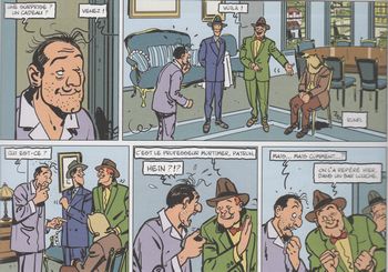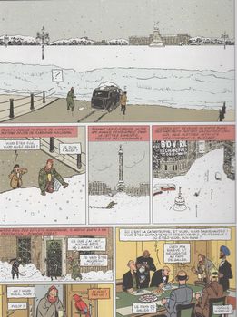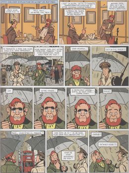 remarques: | troisième volet, 4 ans pllus tard - Blake s'installe dans l'appartement de Mortimer et commence gravement à irriter le gentil mais mou Mortimer qui est aussi tracassé par la bande de Spencer (référence à orange mecanique) - la patience de Mortimer est à bout et il se fabrique une potion pour devenir plus méchant, une sorte de Mr. Hyde - les recherches aboutissent et présentent un Mortimer plein d'énergie qui met son entourage au pas, mais la potion n'a qu'un effet limité et périodiqement Mortimer redevient mou et gentil et surtout ne se souvient plus de son passé en tant que Mr. Hyde >> p. 11 la transformation de Mortimer en Mr. Hyde - et quand il est Mr. Hyde, Morty fréquente les bars de la pègre à Soho - il est reconnu par les complices d'Olrik, il est drogué, capturé et amené devant Olrik qui lui annonce son plan: avec les machines à détraquer le temps du prof. Miloch, Olrik veut provoquer un déluge sur Londres et devenir le maître de l'Angleterre - Blake avec l'inspecteur Kendall partent à la recherche de Mortimer en faisant le tour des bars et autres tripots, tandis que chez Olrik, Morty redevenu Mr. Hyde prend le contrôle des opérations et veut, au lieu de la pluie, provoquer sur Londres une canicule à laquelle les londoniens ne sont pas habitués >> p. 35 la visite des boites à strip tease par Blake et Kendall >> p. 38/39 la séance de brainstorming organisé par Morty - par la suite, Morty provoque une tempête de neige sur Londres, mais redevenu le gentil Mortimer, il veut quitter le repaire d'Olrik et se retrouve en plein pays de Galles >> p. 47 Mortimer au prise avec le dialecte gallois n.b. quelle horreur dira Blake après avoir entendu l'histoire de Mortimer (alors que lui-même est gallois!) >> p. 51 pour supprimer la tempête de neige, Churchill, maintenant premier ministre, fait appel au MI5 - à cause du froid, l'Angleterre n'est plus une île (la Manche est gelée) et des hordes de français commencent à menacer d'envahir l'Angleterre, finalement, le gentil Mortimer, rentré à Londres, oriente la police sur le repaire d'Olrik et les instruments meteo seront rapidement remaniés pour redonner un climat normal sur Londres la zone polaire étant envoyée maintenant sur Paris! - l'empire est à nouveau sauvé >> un troisième et dernier album de ce genre, si le premier album était encore amusant, la série sombre maintenant dans le grotesque et le ridicule, - le scénario n'est pas vraiment recherché ni le graphisme d'ailleurs (on retrouve encore une fois Léon Zitrone comme commentateur radio) et l'épisode gallois n'est pas tellement à sa place tout comme le lancement d'un satellite pour déclancher la tempête de neige avec un Mortimer pauvrement caricaturé qui ne contribue vraiment pas à relever le niveau de qualité (à part quelques anecdotes toutefois assez lourdes) annexes - couverture de l'album - trois illustrations tirées de l'album |