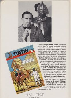 remarques: | titre complet: Edgar-Pierre Jacobs, 30 ans de bandes dessinées préfaces de Greg, Jacques Bergier et Jacques Alexander >> p. 8 à 20 illustrations publiées dans le journal Bravo - le rêve de Jacobs: devenir chanteur d'opéra, mais il fut aussi admirateur de théâtre, lecteur de science fiction et aussi dessinateur de qualité (publicité, catalogue, etc) tout en étant intéressé à l'histoire - la guerre 39-45 devait conduire Jacobs à devenir auteur et dessinateur de bande dessinée avec comme premier début dans le journal Bravo comme auteur d'illustrations diverses pour des contes d'inspiration fantastique ou historique - Jacobs reprend aussi chez Bravo les aventures de Flash Gordon (Gordon l'Intrépide) et à la suite de la censure allemande, création du récit "le rayon U" où apparaissent les ancêtres des héros actuels: - prof. Mardouk = Mortimer, lord Calder = Blake, Dagon = Olrik - première collaboration avec Hergé pour certaines corrections et le coloriage des albums Tintin ainsi qu'avec Raymond Leblanc lors de la parution du Journal Tintin avec le secret de l'espadon, Jacobs travaille alors avec Hergé, Laudy, Cuvelier et Le Rallic >> p. 26 à 29 création des trois principaux personnages de la saga basé sur le rayon U, illustrations de "la guerre des mondes" de H.G. Wells et de l'histoire des "frères de la côte" (Tintin 1946) à noter: la documentation extraordinaire de Jacobs, surtout dans le mystère de la grande pyramide (l'album qu'il préférait le plus), prédilection aussi pour les entrailles de la terre,ceci dû peut'être à l'instinct angoissant du théâtre et de ses décors que Jacobs affectionnait - scénarios également parfaitement étudiés, Jacobs étant un des plus brillants représentants de la bande dessinée d'aventure et de science fiction - la bande dessinée parsème l'histoire(fresques de Lascaux, les hiéroglyphes, la colonne Trajan, les tapisseries de Bayeux, les images d'Epinal, etc) >> p. 32 à 44 illustrations (malheureusement en N&B des premières couvertures du journal Tintin concernant le secret de l'espadon >> p. 45 pélérinage au lieu de travail de Jacobs: le bois des pauvres by François Rivière et Alain Littaye - entretiens avec Jacobs sur la création d'une BD: 1) l'idée, 2) le synopsis (= bref résumé), 3) le scénario 4) le pré-découpage 5) le graphisme - l'influence anglo-saxonne sur Jacobs avec les auteurs: Walter Scott, Charles Dickens, Alan Poe, Kipling, H.G. Wells (le meilleur auteur de SF d'après Jacobs, Robert-Louis Stevenson, mais aussi Dumas, Daudet, Jules Verne, Leroux et Leblanc ainsi que Goethe et Hoffmann; pour la peinture: Dürer, Holbein et Breughel >> p. 61 à 65 une histoire complète (N&B): la découverte du tombeau de Tout Ankh Amon par Howard Carter >> p. 66 à 70 description de l'opéra dans les oeuvres de Jacobs by Francis Bardot, exemple avec la chambre d'Horus = un vrai décor d'opéra ainsi que les costumes, particulièrement dans l'énigme de l'Atlantide >> un album plutôt intéressant avec quelques détails inédits, mais dommage pour le graphisme en noir&blanc qui réduit bien sûr l'impact des illustrations >> à voir aussi dans ce genre: l'opéra de papier et l'affaire Jacobs annexes - jolie couverture de l'album - la passion de Jacobs pour l'histoire - sa maison du bois des pauvres - couverture du disque CD |