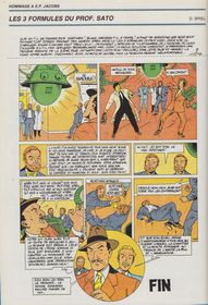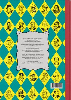 remarques: | - livre d'étude paru après les 30 ans de bande dessinée et après l'opéra de papier, contenant quelques nouveaux secrets sur la vie et l'oeuvre de Jacobs, notamment sur ses rapports avec Hergé, Jacobs et le cinéma ainsi qu'une liste de critiques et de commentaires sur les oeuvres de Jacobs - Jacobs né en 1904, 3 ans avant Hergé travaillait presque uniquement en solitaire (les studios Blake et Mortimer n'apparurent que vers la fin de sa vie) - les éditions Blake et Mortimer fondées en 1982 furent suivies par la fondation Jacobs en 1983 anglophile, Jacobs a souffert de ne pas bien parler l'anglais, c'était toutefois un intarissable bavard au physique imposant, portant presque toujours un noeud-papillon - dessinateur dans Bravo d'abord de Flash Gordon, baptisé Gordon l'intrépide, puis création de sa propre série avec le rayon U (U comme uradium) - 1943, collaboration avec Hergé pour le remaniement et surtout le coloriage des albums Tintin: Tintin au Congo (où Jacobs apparait brièvement en première page avec Hergé et Melkebeke), principalement toutefois pour le sceptre d'Ottokar (balkanisation, les costumes, l'air des bijoux de Faust avec la Castafiore et apparition aussi d'Hergé et de Jacobs avec d'autres personnages du journal Tintin), - Jacobs contribuera aussi à la réalisation des 7 boules de cristal et du temple du soleil - 1946 à 1950, la haute époque du Journal Tintin avec Hergé, Jacobs, Martin, Laudy, Cuvelier et Jacques Melkebeke comme rédacteur en chef, mais en 1947 Jacobs arrête sa collaboration avec Hergé (soi-disant pour une affaire de co-signature) - le secret de l'espadon sera le tout premier album des éditions Lombard, petite collaboration de Jacobs avec Weinberg pour le mystère de la grande pyramide = premier grand travail de documentation (Weinberg aurait-il pu être le disciple de Jacobs?) n.b. la marque jaune n'est pas un M mais un U grec - deux mariages pour Jacobs: 1er mariage avec Ninie la chanteuse qui fut le modèle de quelques nus à l'aquarelle et de Sylvia dans le rayon U; 2ème mariage avec Jeanne Quittelier, une pianiste renommée - la censure effectuée sur les ptérodactyles de l'énigme de l'Atlantide serait le fait d'Hergé lui-même a lors rédacteur artistique de Tintin, le piège diabolique était peut'être (tout comme Tintin au Tibet pour Hergé) un problème pour Jacobs, dans ce récit avec Mortimer en solo, - c'est Jacobs qui se raconte lui-même, pris dans le piège de la BD qui s'est refermé sur son auteur, une période de désarroi pour Jacobs - le piège diabolique est aussi l'occasion de développer sa philosophie du monde et de l'histoire, mais causera également des ennuis à Jacobs en 1962 avec la censure française (album interdit en France temporairement) - l'affaire du collier reprend un récit plus calme, avec au début la collaboration de Gérald Forton, mais par la suite Jacobs reprendra le récit en solitaire >> à noter: le style différent en première partie de l'album pour les personnages féminins et pour le texte - les temps changent pour Jacobs dans l'après 1968 (Beatles, anti-militarisme), lui et Hergé sont critiqués pour un certain racisme dans leurs premiers albums (Tintin au Congo et les jaunes dans le secret de l'espadon) - mort de sa femme Jeanne le 31.10.1977, ce ne sera plus la même vie pour Jacobs qui entreprend toutefois en 1981 son album "l'opéra de papier" en collaboration avec Lebedel (texte) et Jacques Tardi (la couverture) - le retard pour la suite des trois formules du prof. Sato (le scénario était ébauché tout comme le découpage, mais restait le graphisme à terminer), retard pour plusieurs raisons dont: a) dû à l'abhorration de Jacobs pour la mise à encre b) arthrose des doigts c) désintérêt de Jacobs pour les trois formules - quelques difficultées avec Hergé qui refuse la collaboration à Jacobs de Bob de Moor, alors engagé dans les studios Hergé, la non participation de Chaillet qui est déjà engagé avec Martin et qui veut monter sa propre série Vasco; finalement à la mort d'Hergé, ce sera quand même Bob de Moor qui sera choisi pour composer le tome 2 des trois formules - en 1980, Jacobs rompt avec les éditions Lombard pour cause de copyright, création des éditions Blake et Mortimer avec Claude Lefrancq et enfin pour tout remanier, création des studios Jacobs avec Philippe Biermé comme directeur - démêlés aussi avec le fisc belge et autres soucis pour Jacobs qui meurt le 20.2.1987 diminué physiquement à 84 ans, il meurt un peu misérablement, mais il aura eu le temps de préparer sa mort et l'après-Jacobs; sur sa tombe, on lui élevera un sphinx miniature (n.b. ce qui ne sera pas vraiment le cas, car son héritage sera quelque peu dilapidé par ses héritiers spirituels, dont la destruction de sa maison du bois des pauvres où Jacobs aurait voulu ériger un musée Jacobs) Epiloge A) contrairement à Tintin et l'Alph'art, le tome 2 des trois formules du prof. Sato (Mortimer contre Mortimer) sera achevé par Bob de Moor en 1990; pour Jacobs, c'était le voyage au bout de lui-même comme ordonné par le prof Sato (ressemblance avec Jacobs) à son androïde: "ojoshiro" = cesse de vivre) B) Jacobs et le cinéma avec en plus le disque "la marque jaune" sur un superbe dialogue et qui connut un grand succès, films assimilant des analogies avec les aventures de Blake et Mortimer et dont peut'être Jacobs s'est quelque peu inspiré principalement pour: la cité foudroyée (1923), le monde perdu (1925), les Nibelungen (1928, pour le dragon Ryu), la momie (1932), le cabinet du dr. Caligari (1919), Metropolis (1920), le dr Mabuse (1922), M le maudit (1931), le troisième homme (1949, pour les égoûts), la guerre des mondes (1953), le tombeau hindou (1958), la machine à explorer le temps (1960) et plusieurs autres plus ou moins assimilés + adaptation de films sur la série Blake et Mortimer dont les meilleurs: le secret de l'espadon et la 