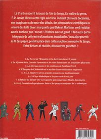 remarques: | - de 1946 à 1971 les personnages de Jacobs présentés par une série d'auteurs dont Didier Pasamonik et François Rivière - 1970 première rencontre avec Jacobs au bois des pauvres (entretiens) - fin 1945, une série Jacobs+Hergé = Olav = 3 synopsis: récit de trappeurs, histoire policière à Shangaï et un western qui sera repris par Cuvelier sous le titre "le canyon mystérieux" avec Tom Colby 1/ Mortimer, le numéro 1 de la série description de Mortimer avec Blake comme no 2, Blake étant le sosie de Jacques Laudy (1907-1993), fils du peintre officiel de la cour royal de Belgique et Jacques Melkebeke (1904-1983), sosie de Mortimer, sparring partner de Jacobs, quelque peu mal connu et condamné pour collaboration avec l'ennemi lors de la libération + Nasir, le fidèle serviteur, il disparaîtra après la marque jaune, mais réapparait comme agent secret indien dans les sarcophages du 6ème continent 2/ le péril jaune - déjà exprimé en 1895 par l'empereur Guillaume II - la question démographique, émigration des chinois dès 1895, surtout vers la côte ouest des Etats-Unis (construction du chemin du chemin de fer) - guerre des Boxers en 1900, guerre russo-japonaise pour la Mandchourie en 1904 à notre époque, c'est plutôt la guerre économique 3/ Blake, le no 2 - description de Blake, = personnage réfléchi, maître de ses nerfs en toutes circonstances, c'est le parfait représentant du phlegme britannique, membre du très select Centaur Club à Piccadilly Circus - description du Herr Doktor Grossgrabenstein, collectionneur toqué, mais grand connaisseur en égyptologie, personnage atypique dans les aventures de Blake et Mortimer >> p. 34 son livre: autopsie d'une momie de la XXIème dynastie - l'histoire de la pierre de Maspéro (totalement inventée par Jacobs, mais sur un fond de vérité) indiquant le passage à la chambre d'Horus >> p. 37 d'un tombeau à l'autre: la tombe de Jacobs avec son sphinx et son épitaphe 4/ le secret des rites funéraires égyptiens - description de la grande pyramide construite par Kheops (2600 BC), sa construction reste toujours encore un mystère - culte dédié à la préservation du corps après la mort (momification) le mastaba = chambre funéraire 5/ description d'Olrik - l'incarnation du mal dans la bande dessinée, il échoue systématiquement dans ses tentatives mais il est indestructible, un bandit élégant - description du dr. Septimus, le savant fou, mais à cause de la censure, Jacobs devra en fin de récit le faire disparaître - commentaires sur le trésor et la couronne royale britannique, sur le télécéphaloscope, Limehouse dock, etc >> p. 49 la couverture originale pour le Journal Tintin qui avait été censurée par Hergé 6/ dans les coulisses de Scotland Yard - en 1829, Robert Peel, alors ministre de l'Intérieur, créa la Metropolitan Police Service (la MET), dont les agents sont surnommés les "bobbies" et dont le quartier général était à Great Scotland Yard d'où son nom (Scotland Yard = cour d'Ecosse = domicile à Londres des rois écossais), 1890 création de New Scotland Yard - l'inspecteur Roland Tanner sera l'une des sources d'inspiration de Conan Doyle pour son personnage de Sherlock Holmes (1887) - début en 1878 de la police scientifique CID (criminal investigation department) 7/ le nouvel Icare - le jeune prince, chef de l'aviation atlante, et son père, le basileus représentent le bien, alors que Magon le phulacontarque (chef de la garde) et ses complices, les barbares, représentent le mal >> p. 59 la cité futuriste de l'Atlantide, commentaires sur l'orichalque (métal mythique) et l'affaire des ptérodactyles 8/ l'Atlantide, un continent englouti - domaine de Poseidon au centre de l'Atlantique, les Atlantes seraient alors les descendants du dieu de la mer, une terre pourvue de grandes richesses, c'est aussi alors une puisssance maritime, rivalité avec l'ancienne Athènes, mais vers 9000 BC, fâché par l'attitude orgueilleuse des Atlantes, Jupiter fit disparaître l'Atlantide - ceci est raconté par Platon dans ses "Timée" et "Critias", histoire tenue de Solon qui lui-même l'avait apprise d'un vieux prêtre égyptien, le problème sur la situation de l'Atlantide: les Açores (où Jacobs la situe), les Canaries ou Santorin - mythe qui contient toutefois deux enseignements: le modèle de la cité idéale et l'exemple de la dégradation d'une société - la littérature et le fantastique se sont inspirés de cette légende dont Jacobs en fera une sorte d'opéra souterrain 9/ Miloch, le savant fou - incarnation de la science dévoyée, ressemblance avec l'écrivain Arthur Miller, sous les ordres du "général" qui, lui, ressemble à Anastase Mikoyan de SOS météores = domination de la foudre en boule (analogie avec les 7 boules de cristal,) son contraire: le brave professeur Labrousse 10/ le climat dans tous ses états - en 1855, l'astronome Urbain Leverrier organise pour la première fois les "bulletins du temps" avant qu'un organisme spécifique, l'ancêtre de Meteo France, prenne la relève à partir de 1873 et le propre du climat est justement de varier, les vagues de froid et de chaleur se succédant par intermittence - différence entre météorologie = prévision du temps qu'il va faire à brève échéance alors que la climatologie regarde vers le passé en moyennant les mesures sur plusieurs décennies, le SOS météores de Jacobs sera le premier album du genre en science-fiction 11/ les seigneurs de la Roche - le méchant seigneur Gui de la Roche à l'époque des "jacqueries" (révoltes paysannes) et la gentille Agnès de la Roche, fille de Gui, (seule personnage féminin dans les oeuvres de Jacobs) le piège diabolique = voyage dans le temps avec le chronoscaphe 12/ la guerre de Cent Ans, une haine inexpiable - 1337-1453 début avec la lutte entre Capétiens et Plantagenêts sur lesquels Philippe-Auguste prendra l'avantage à la bataille de Bouvines (1214), puis c'est l'a