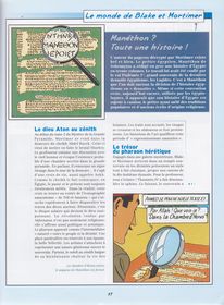 remarques: | fascicule no 8 d'avril 2011, la voiture à dais du mystère de la grande pyramide 1/ la voiture à dais - rencontre entre les professeurs Mortimer et Grossgrabenstein, tous deux férus d'égyptologie - les deux premiers pionniers de l'automobile en Europe: Daimler et Peugeot - le modèle de la voiture de Grossgrabenstein n'est pas précisé, mais il s'agit probablement d'une Ford 1905 (sans dais bien sûr), toutefois le dais est totalement irréaliste sur une automobile, ce serait plutôt le principe de la capote replié bien que sous le soleil d'Egypte, le dais conviendrait parfaitement >> p. 5 les types de carosserie: berline, conduite intérieure, coupé, landaulet, limousine, cabriolet, phaéton et torpedo, il y a aussi roadster, spider, pick up et break n.b. le phaéton est une automobile découverte équipée de fauteuils à dossier haut protégeant les passagers arrière, une torpédo est une automobile décapotable, il s'agit d'un double phaéton, le landaulet est un genre de coupé - le premier démarreur électrique par clé fut innové par Cadillac en 1912 n.b. en 1910 il y avait env. 500'000 voitures immatriculés aux USA et 50'000 en France 2/ Jacobs: l'expérience du service militaire - dès 1924 à l'armée, Jacobs est affecté au peloton spécial où il lui est demandé de dessiner pour l'armée, - il passera la plupart de son service (12 mois) dans les troupes d'occcupation en Allemagne et il y organisera aussi des représentations théâtrales pour la troupe 3/ l'inspecteur-chef Kendall - un des plus fins limiers de Scotland Yard, il se donne corps et âme à son travail, mais il est aussi impulsif et parfois prudent et timoré, le contraste avec Blake est saisissant 4/ Akhenaton, sur les traces du pharaon maudit - basé sur le légendaire Akhenaton, Jacobs décide de commencer une aventure d'archéologie-fiction avec chasse au trésor >> p. 16 description d'Aménophis IV et de sa belle épouse Nefertiti, qui prendra au XIVème siècle avant Jesus Christ le nom d'Akhenaton introduisant le culte d'Aton, le dieu solaire monothéiste qui ne durera que le temps de son règne et sa nouvelle capitale Akhetaton fut vite oubliée , elle s'appelle aujourd'hui Tell el-Amarna - l'existence probable d'une chambre secrète dans la grande pyramide fera rencontrer Mortimer, grâce à la découverte inopinée d'une partie inconnue des papyrus de Manéthon, avec le cheikh Abdel Razek, l'initié, dernier descendant des prêtres d'Aton à noter: Mortimer découvrira dans le mur de la maison d'Abdel Razek un signe étrange d'écriture ancienne, il s'agit d'une croix de vie appelée ankh par laquelle le cheikh révèlera à Mortimer le chemin de l'initié et c'est dans la chambre d'Horus où se trouve le trésor d'Akhenaton que va se jouer le dernier acte n.b. pour ce trésor, Jacobs s'inspirera du trésor de Toutankhamon à noter aussi: si les papyrus de Manéthon ont bien existé et retrouvés (du moins en partie), la pierre de Maspéro comme mentionnée par Mortimer n'est bien sûr qu'une invention de Jacobs 5/ le mystère de la grande pyramide, tome 1 (1954) - après son aventure sur la guerre mondiale, Jacobs voulut donner une valeur éducative à son prochain récit en se référant à la civilisation égyptienne - Jacobs mit trois ans pour se documenter et sa chambre secrète dans la grande pyramide n'a toujours pas été découverte (malgré plusieurs tentatives d'exploration) - et pour retrouver la chambre secrète d'Horus, Jacobs grâce au papyrus put faire partir l'itinéraire depuis un mastaba situé tout près du Grand Sphinx - bien que planifié, un voyage de Jacobs en Egypte ne pourra pas se réaliser et il eut recours à des intermédiaires, telle celle d'une dame de la haute société égyptienne, connue à Bruxelles: Cerès Wissa Wassef - et c'est d'après la demeure de cette dame que Jacobs dessina la villa de Grossgrabenstein tout comme le Mena House hotel et le Shepheard's hotel avec lesquels Jacobs prit contact à noter: la cartouche d'hiéroglyphes sur les couvertures des albums signifiant "Jacobs" en égyptien ancien >> un très bon cahier instructif, surtout pour les deux derniers chapitres annexes - couverture du fascicule - la page de Manéthon et de Maspéro - coupe de la grande pyramide - la chambre d'Horus - la statue d'Akhenaton, le pharaon maudit - une Ford 1914 à carosserie ouverte et avec une épaisse capeline = capote repliable |