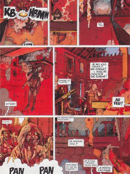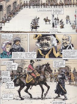 remarques: | février 1802, retour en France retrouvaille avec Capucine, alias Anastasia qui est maintenant mariée après avoir attendu en vain le retour de Morvan qui maintenant rejoint son régiment où il est mis aux arrêts pour rebellion et meurtre de son capitaine il sera innocenté grâce au témoignage de Joseph, l'assistant de feu le professeur Nathan en route pour son domaine de d'Andigny, Morvan et ses amis sont agressés par une bande de brigands, dont le chef s'appelle Fillette, qui ont pris possession du château des d'Andigny, un des leurs meurt, mais les autres seront délivrés par les paysans du domaine qui vivent cachés dans les bois >> p. 20 le groupe dénudé des victimes par un passage secret, Morvan prend les bandits par surprise et ce sera la grande bagarre en rouge vif et sanglant (pages 42 et 43) dans les salles du château qui prend feu après avoir confié le domaine à son ami Gruchet, Morvan, le soldat Nicolas et Nourdin l'égyptien partent pour de nouvelles aventures >> un scénario assez bien élaboré avec un graphisme respectable dont le coloriage finit en rouge éclatant bien marqué |