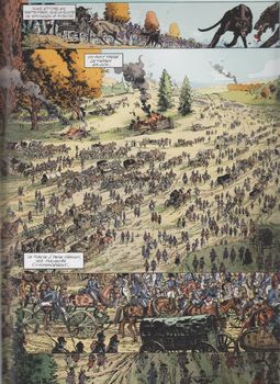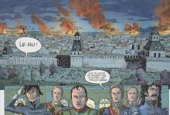remarques: | série qui comportera 3 tomes (tout comme la série de la bataille), d'après le livre "il neigeait" de Patrick Rambaud Napoleon contrôlait l'Europe et la France de 130 départements (1812), mais sa flotte avait été anéantie il essaie alors de vaincre l'Angleterre en établissant un blocus continental, mais la Russie ne suivait pas les instructions de Napoleon qui voulut ainsi châtier la Russie et son tsar, Napoleon envahit la Russie en traversant le Niemen avec 500'000 hommes en juin 1812 >> pages de garde: Napoleon avec sa cour et son état-major 1/ Moscou 1812 l'avance avait mal commencé et pas de victoire genre Austerlitz sauf quelques escarmouches, tactique par les russes de la terre brûlée, et à la grande bataille de Borodino sur la Moskova, Napoleon avait gagné la partie, toutefois l'armée russe n'avait pas été vaincue >> p. 12/13 l'arrivée à Moscou l'entrée de Napoleon dans une Moscou désertée avec son armée et les gens de sa maison dont Roque son secrétaire et Masquelet, son cuisinier >> p. 31 la découverte des comédiens français à Moscou fin septembre 1812, Moscou commence à prendre feu et Bausset, le chef de l'intendance commence aussi à s'inquiéter 2/ le feu plusieurs entrées de maisons sont sabotées et explosent, les incendiaires de Koutouzov étaient à l'oeuvre et les pompes à incendie avaient été retirées par les russes >> p. 48 Moscou en flamme l'incendie atteint le Kremlin et Napoleon doit quitter la ville pour s'installer à Petrovsky, la résidence d'été du tsar au sud de Moscou la retraite commence déjà dans la confusion d'Herbigny sauve la vie du lieutenant Martinon >> p. 59 l'armée sort de Moscou en 1812, Moscou avec 270'000 habitants, était une des plus belles villes d'Europe et pratiquement tout le centre de la ville fut dévasté par l'incendie l'album raconte surtout l'histoire du capitaine d'Herbigny des dragons de la garde et de son serviteur Paulin >> un bon album, toujours de belles illustrations toutefois un peu moins expressif que les trois tomes de la série "la bataille" |