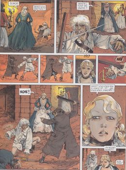 remarques: | octobre 1804, Bonaparte est devenu empereur des français, Morvan, avec son ami égyptien Nourdin, est appelé au camp de Boulogne où son ami Nicolas la Giberne est impliqué dans une sale affaire >> p. 6 avec son égyptien qui parle "tri ixactimont" le problème de Nicolas réside en le capitaine St-Didier, Morvan est contacté par le policier Torcy, attaché à la sécurité du camp de Boulogne qui lui signale l'existence d'un réseau de terroristes chargés par les anglais de déstabiliser le camp de Boulogne >> p. 30 rencontre avec Mme Hortense (voir tome 2) >> p. 40 pour une fois, c'est Nourdin qui est patron Saint-Didier sera mis hors d'état de nuire après que Morvan aura éliminé de drôles de terroristes par la force et le sang >> un scénario bringuebalant (instable) composé de bribes de textes dans les vignettes (Vaxelaire a bien fait de quitter la série au camp de Boulogne), mais le graphisme n'est pas non plus très élaboré |