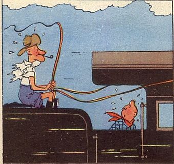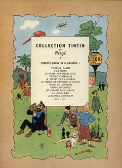 remarques: | 2ème édition couleur, 1947, dos rouge, B1 1er plat titre en noir sur fond bleu page de titre: vignette et titre en rouge pages de garde: bleu fonçé avec figurines 4ème plat: dernier titre le sceptre d'Ottokar Tintin en Amérique en septième position avec pull Haddock en deux couleurs album de 62 pages (mais 12 cases par page) au lieu des 120 pages de l'album N&B, parution dans le Petit XXème de septembre 1931 à octobre 1932 album N&B 1932, album couleur 1946 résumé >> voir aussi archives Hergé tome 1 la trame se compose à nouveau de diverses péripéties mais moins désordonnée, on distingue deux parties: Tintin à Chicago et Tintin au Far West arrivé à Chicago, hôtel Osborne, première tentative d'enlèvement, rencontre avec Al Capone et ses gangsters >> p. 8 erreur d'anglais: wonderfull au lieu de wonderful (écrit correctment dans l'album N&B) et qui sera corrigée bien plus tard dans les rééditions >> p. 9 un drôle de fil téléphonique >> p. 10 deux belles cases mémorables >> p. 11 le G.S.C. gangsters' syndicate of Chicago >> p. 12 les honoraires de gangster ont baissé par rapport à l'album N&B >> p. 16 Tintin se lance à la chasse de Bob Smiles, direction Redskincity >> p. 17 Tintin habillé en cow boy choisit un cheval plutôt calme >> p. 19 capturé par les Pieds Noirs (au lieu des Orteils ficelés dans l'album N&B) >> p. 21 une belle case remaniée n.b. les chevaux sont maintenant beaucoup mieux dessinés que dans l'album N&B >> p. 22/23 la bagarre mémorable entre la Taupe-au-regard-perçant, Bison-flegmatique et Oeil-de-boeuf >> p. 29 critique du business américain, racisme contre les peaux-rouges >> p. 31-33 la course folle de la loco >> p. 36/37 le lynchage et l'alcoolisme n.b. après le hold-up 7 nègres sont immédiatement pendus >> p. 40 Tintin échappe de peu à la mort >> p. 44 la capture de Bob Smiles >> p. 45 Milou est enlevé, le détective Mike Mac Adam détecte, les cris du bébé qui ressemblent à ceux de Milou >> p. 53 visite des usines de conserves Slift (le marteau d'abattage ne figure plus dans la case) >> p. 57 le Comité Central d'aide et de secours aux gangsters nécessiteux >> p. 59 dernier enlèvement (les bourreaux chinois ne figurent plus avec le chef des gangsters et Milou est jeté dans le lac ensemble avec Tintin, contrairement au développement dans l'album N&B)) >> p. 60/61 une affaire d'haltères >> un bon album, remaniement du graphisme qui respecte en général les cases de l'édition originale, mais qui les embellit (les chevaux sont mieux dessinés, la charge des Pieds Noirs = case mémorable en p. 21) par contre le texte devient plus soigné, la narration des images est plus fluide et le travail de documentation plus élaboré, Hergé dut toutefois supprimer toute mixité raciale, par contre la critique sur l'économie et la société américaine subsistent (le capitalisme, société de consommation, les échange >> lire en p. 53 "pour combattre la crise, nous faisons des échanges, les usines d'automobiles nous envoient leurs vieilles voitures et nous en faisons des boites de corned beef neuves; de notre côté nous leur fournissons les boites de conserve usagées que nos agents rassemblent dans le monde entier, les usines d'automobiles en fabriquent un modèle super-sport qui a beaucoup de succès! >> p. 54 la grève surprise parce que la direction a baissé les prix auxquels on nous rachetait les chiens, les chats et les rats qui servaient à fabriquer le pâté de lièvre (mais pas le corned beef), toutefois défense des peaux-rouges n.b. documentation selon le livre de René Thevenin (1928) "moeurs et histoires des indiens peaux-rouges" exemplaire en très bon état, plats peu frottés et coins piquants dos et intérieur parfait estimation BDM en BE 500.- annexes - 1er et 4ème plat de l'album (pull deux couleurs) - case mémorables en p. 3, 6 et 31 Information - depuis 1925, Georges Remi, qui signe son travail sous le pseudonyme Hergé, est employé au Vingtième Siècle, ce journal de Bruxelles est résolument catholique et conservateur, et surtout proche d'une idéologie fasciste qu'incarne Benito Mussolini en Italie, tenu en haute estime par le rédacteur en chef l'abbé Norbert Wallez; le quotidien se définit d'ailleurs comme un "journal catholique de doctrine et d’information" - depuis la fin de l'année 1928, Hergé dirige un supplément pour la jeunesse, Le Petit Vingtième, qui est intégré au Vingtième Siècle; outre ses travaux quotidiens et ses réalisations publicitaires, il y publie la série humoristique Quick et Flupke à partir de janvier 1930 et surtout les débuts des futures aventures de Tintin avec les récits Tintin au pays des Soviets de janvier 1929 à mai 1930 et Tintin au Congo de juin 1930 à juin 1931, le succès est largement au rendez-vous il rencontre également en mai 1931 Alain Saint-Ogan, l'un de ses modèles déclarés, et reçoit ses encouragements à persévérer dans le métier de la bande dessinée - afin de réduire la charge de travail qui s'accumule, il est accompagné par Eugène Van Nyverseel alias Evany et Paul Jamin, deux assistants embauchés par son rédacteur en chef Norbert Wallez, respectivement en 1930 et 1931 il travaille également avec Germaine Kieckens, la secrétaire de Wallez, dont il est amoureux en 1930, pendant la publication de Tintin au Congo, il multiplie les approches, en vain, car elle préfèrerait un mari plus âgé; devant sa persévérance et vu le soutien de l'abbé pour leur union, Germaine se décide malgré tout en mai 1931 à l'épouser, leurs fiançailles se déroulent le 21 février 1932, avant leur mariage le 20 juillet 1932; pendant et après cette période, Hergé couche souvent Germaine et leur vie quotidienne sur le papier, au crayon ou au pinceau; ces croquis montrent l'émergence du futur style de dessin de l'auteur, la célèbre "ligne claire" - pour les aventures de Tintin, reporter à Chicago, Hergé rassemble 