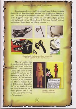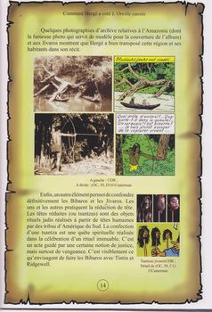 remarques: | dans la série "comment Hergé a créé", tome 5 l'oreille cassée (genre making of), épisodes inspirés de: - la guerre du Gran Chaco dont on a peu parlé en Europe - réminiscences du lotus bleu: les symboles chinois, tintin en pyjama oriental - préparation à la guerre (similitude avec Popol et Virginie pour les flèches) + le thème de la foudre - les masques et sculptures africains - le fétiche = statue de style pré-colombien - doc. sur les derniers indiens primitifs de l'Amazonie selon le livre de Marquis de Wavrin - les arumbayas inspirés des indiens jivaros - la technique de la tête réduite (chasseurs de tête) >> p. 14 la case avec la fameuse pirogue de Tintin (sur les rapides de l'Urubamba), reproduite d'une photo d'époque - le poison curare et sa description - l'article du Crapouillot sur la guerre du Gran Chaco, une goutte de pétrole vaut une goutte de sang la guerre secrète entre les compagnies pétrolifères anglaises et américaines - le rôle de Zaharoff et les pratiques douteuses de l'industrie d'armement >> p. 23 les modèles d'avions dont l'hydravion Liore+Olivier H24 - l'idée de retrouver l'explorateur perdu - l'enquête de Tintin à la mode Sherlock Holmès - similitude avec le film "the captain hates the sea" (1934) - littérature: l'homme à l'oreille cassée par Edmont About - doc. la guerre du Chaco, la valse des dictateurs en Bolivie - Percy Fawcet, l'histoire authentique de l'explorateur perdu à la recherche d'une cité antique en 1925 inspira le personnage de Ridgewell - le collectionneur Samuel Goldwyn (producteur de films) appelé Goldwood dans l'épisode de Tintin) - allusion à la guerre italo-éthiopienne en 1935 - les pays sud-américains: San Theodoros = Bolivie, Nuevo Rico = Paraguay avec capitale Sanfacion (Asuncion) - un pays sud-américain mentionné sur la carte p. 62 de l'album - le mystérieux langage des arumbayas qui provient principalement du dialecte bruxellois >> pas de changement notable entre l'édition N&B et couleur, sauf les 7 vignettes du début de l'album N&B (le rêve de Tintin) récit constitué à partir d'une succession de temps forts (actualités de l'époque) et d'images marquantes (selon le même principe qu'appliquait Hitchcock) le développement du récit est basé beaucoup sur une documentation richement détaillée de l'époque >>> un bon album de Bedestory annexes - couverture de l'album - le fameux fétiche - la jungle sud-américaine |