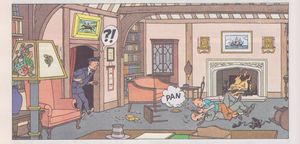 remarques: | B41, réédition de l'album 1943 redessiné en 1966 sur demande de l'éditeur anglais par Hergé avec la collaboration de Bob de Moor cette version est modernisée et surtout le décor avec paysages sont mieux présentés et plus soignés, texte pratiquement inchangé et par rapport à l'édition 1943 quelques passages dans le graphisme ont été rectifiés et mieux expliqués >> p. 1 par rapport à l'édition 1943, Tintin ne porte plus de cravatte mais simplement un pull >> p. 2 Eastbury devient Eastdown >> p. 3 le chemin de fer est maintenant électrifié >> p. 4 les bretelles des Dupont(d) >> p. 7 les voitures sont adaptées aux années 60 la tenue du chauffeur Ivan a changé >> p. 16 le salon bien anglais de la villa du dr Müller >> p. 21 la brigade des pompiers a été modernisée, Henry est devenu Harry >> p. 30 Tintin est pris en charge par une voiture Austin au lieu d'un vieux camion >> p. 31 par rapport à l'album EO, Tintin est nettement moins sale qu'avec la loco à vapeur >> p. 31 explication concernant le déplacement de Milou depuis les toits du train >> p. 33-35 le whisky Johnnie Walker est maintenant devenu Loch Lomond >> p. 38 la clôture est devenue un mur de pierre sèche, mais le texte mentionne toujours une clôture >> p. 43 belle vignette redessinée du château de Ben More >> p. 54 la liste des complices a été corrigée (Potsdam au lieu de Postdam) le poste TV et l'émetteur radio sont plus modernes >> p. 62 le vieil avion à hélice a été remplacé par un avion avec réacteurs résumé et autres détails >> voir l'album couleur A20 n.b. l'édition originale de 1966 est côtée au BDM Euros 250.- annexes - 1er et 4ème plat de l'album - 4 cases mémorables - l'annonce par Hergé annonçant le changement effectué sur le nouvel album |