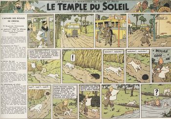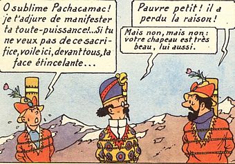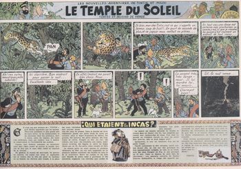 remarques: | la première version intégrale des aventures de Tintin au pays des Incas prépublication dans Le Soir en minuscules strips quotidiens N&B à un rythme plutôt irrégulier à partir du 16.12.1943 avec au côté d'Hergé à partir du 1.1.1944 E.P. Jacobs, perfectionniste de nature, qui apporta sa collaboration surtout pour la documentation et la couleur par rapport aux strips parus dans Le Soir, plusieurs cases et strips anecdotiques seront modifiés ou supprimés, l'histoire fut interrompue plusieurs fois, en janvier 1944 et surtout en septembre 44 lors de la libération une interruption qui allait durer deux ans de par le problème de collaboration dont lequel Hergé avait été mêlé en septembre 1946 avec la parution du journal Tintin par Raymond Leblanc (un ancien résistant) et avec l'équipe du journal (Hergé, Jacobs, Melkebeke, Laudy et Cuvelier) les aventures de Tintin reprennent sous le titre "le temple du soleil" en double page centrale avec durant 8 semaines une rubrique en bas de page intitulée "qui étaient les Incas?" nouvelle interruption en juin 1947 suite à un Hergé déprimé le 22.4.1948 la prépublication se termine enfin et la version en album parait en 1949 avec quelques modifications n.b. la version originale reprend au début quelques pages de la fin des 7 boules de cristal correspondant aux pages 51 à 62 de l'album avec un résumé des 7 boules de cristal, un épisode de Milou au prise avec un hérisson et en dernière page du whisky au lieu du monocle commentaires et modifications: >> p. 5 la momie Parakas qui fut pris comme modèle et qui resta le personnage le plus effrayant des aventures de Tintin >> p. 13 le repérage de la villa Bergamotte >> p. 18 épisode écourté avec le chat sur le Pachacamac >> p. 22 à 37 plusieurs cases supprimées: la mégère, le senor barbu, l'écho, le coca à la place du whisky >> p. 33 courte apparition de l'Inca Huascar >> p. 36 le façe à façe d'Haddock avec le crâne (tête de mort) >> p. 47 à 54 planches avec les commentaires en bas de page: qui étaient les incas? >> p. 51 les épisodes avec le jaguar et le serpent qui seront supprimés >> p. 59 Haddock trouve de l'or et p. 61 doit l'abandonner avec regret >> p. 62 deux case supprimées avec Haddock >> p. 70 la devise des Dupond(t): motus et touche cousue au lieu de botus et mouche cousue >> p. 72 le soleil est éclipsé par la gauche (dans l'album elle le sera par la droite) >> une édition intéressante surtout pour la comparaison avec l'album modifié B3 de 1949 annexes - couverture de l'album - 3 cases mémorables de l'album B3 - 1 planche avec qui étaient les incas - 1ère planche avec la reprise des 7 boules de cristal information le temple du Soleil ou Coricancha, littéralement, en quechua: "enceinte de l'or", représentait le lieu le plus sacré de l'empire des Incas, c'est à partir du Coricancha que rayonnait le système des Ceques, ce système était composé de quarante-et-une lignes imaginaires, le long desquelles s'agençaient trois-cent-vingt-huit huacas dispersés de part et d'autre de Tahuantinsuyu, cette organisation particulière permit un contrôle total de l'empire à partir de Cuzco, dressé au centre de la capitale de l'empire Inca Cuzco, cet édifice, dont subsistent d'importants vestiges qui ont récemment été remis en valeur, était le théâtre des cérémonies importantes des souverains Incas: mariages, sacres, funérailles, c'est là que leurs momies étaient conservées, assises sur des trônes en or, il fut le plus vaste et le plus richement orné de son époque: ses grands murs de pierre, en appareillage inca, mesuraient 140 m de long sur 135 m de large; les chroniqueurs espagnols ont abondamment décrit ses richesses fabuleuses, avant qu'elles ne soient fondues ou éparpillées: le pourtour du temple, aux murs peints en bleu, était orné d'une énorme corniche en or, les autels, les portes, les statues, étaient décorées de planches d'or et d'argent, parfois incrustées de pierres précieuses qui, de jour comme de nuit, reflétaient la lumière du jour ou bien celle des torches, la porte principale, ornée de motifs d'or et d'argent, s'ouvrait sur un grand sanctuaire, au-dessus de l'autel, étincelait un grand disque d'or, censé représenter le Soleil, il était placé de telle manière que les rayons du soleil levant le frappaient et le faisaient resplendir, à l'arrivée des Espagnols, il fut rasé et pillé de fond en comble, les plaques d'or couvrant les murs furent arrachées et les momies des anciens Incas profanées, il ne resta debout que les fondations qui, peu après, servirent d'assise à la construction de l'église et du couvent Santo Domingo |