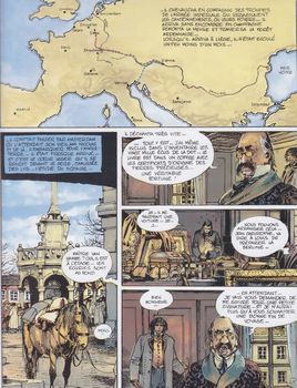 remarques: | Vienne, décembre 1805 ré-apparition de Madame Hortense qui nous apprend que Capucine, alias Anastasia, est l'épouse d'un certain Tusseau, chef de bandits, mais Capucine est toujours encore amoureuse de Morvan quant à Morvan, il est en route pour Austerlitz où il arrive après la bataille, retour à Vienne sans gloire pour lui où il est abordé par le commisaire Camano qui enquête sur trois meurtres alors qu'il y a eu des milliers de meurtres sur le champ de bataille >> p. 35 l'atttaque des loups repoussée par Morvan, facile puisqu'il est frère des loups >> p. 38 avec l'armée française logée à Vienne, la ville est devenu un vrai foutoir (grand désordre) >> p. 41 le duel pour l'honneur durant lequel Morvan reste en vie grâce à un éternuement finalement retour à Liège pour Morvan qui veut rejoindre son compagnon Nicolas en poste en Hollande d'où le titre du prochain album: destinées bataves n.b. même le BDM y perd son latin en mentionnant pour cet album trois rééditions 3a, 4a et 5a alors qu'en fait il n'y en eut qu'une en 2005 par les éditions Theloma >> la série part vraiment à la dérive tant pour le scénario que pour le graphisme, 3 autres albums parus (non collectionnés): - tome 9 (1995) destinées bataves - tome 10 (1996) Albion côté jardin, - tome 11 (1998) la chasse au loup = dernier album de la série, ces albums ont fait l'objet d'une réédition en 2005 et 2007 (chasse au loup) annexes - couverture de l'album - extrait de page - réédition du tome 8 - couverture des trois prochains albums dont le dernier étant la chasse au loup qui rejoint quelque peu le tome 1: la dent du loup |
