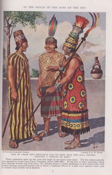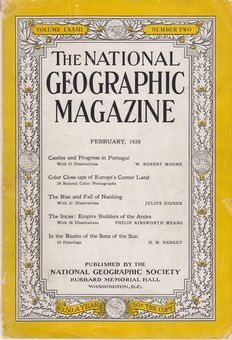 remarques: | National Geographic magazine No. 2, February 1938 with three titles: 1/ castles and progress in Portugal 2/ the rise and fall of Nanking and 3/ the Incas: empire builders of the Andes - of Quechua origin, the building of the Inca realm, - the Inca masonry: centuries have passed, but Inca walls (like the Egyptian ones) still stand - the Incas, sons of the sun - the llama which in protest ejects from its mouth "a wonderful stinking water" as explained by an explorer - llamas and their longer-wooled relatives: the alpacas - the high priests of the sun, the snake-dancing, - Cuzco, ancient capital of the Incas - the temple of Pachacamac with the golden image of the sun where mummies have been found - the ruins of the citadel of Sacsahuaman - the citadel of Machu Picchu uncovered in 1912 - the habit of chewing the leaves of the coca shrub is widespread among Indians of the Andes to increase their physical endurance (cocaïn being extracted from coca) enclosurs - cover of national geo no 2 February 1938 - three Inca noblemen in discussion on the road painting by H.M. Herget - inca prince on the throne with priests and soldiers painting by H.M. Herget - view 1938 of Machu Picchu discovered 1912 by the expedition of Hiram Bingham further commentaries by Philip Ainsworth Means and paintings by H.M Herget commentaires et illustrations dont s'est grandement inspiré Hergé pour son histoire du temple du soleil principalement pour les personnages et leurs costumes |