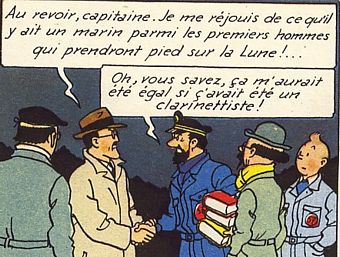 remarques: | double album (objectif lune et on a marché sur la lune), mais avec des couleurs quelque peu criardes sur un papier différent + 16 pages d'archives la science, la fiction et la réalité début d'un récit extraordinaire en mars 1950 Hergé, un visionnaire, mais sans faire dans la science-fiction récit scientifique et aventure plausible >> p. 4/5 planche d'essai pour le début d'objectif lune un travail de documentation considérable avec maquettes à l'appui et avec la collaboration de Bob de Moor, Hergé allège les propos scientifiques en y mêlant un humour spécifique plein de finesse Wolff, un personnage mystérieux, appartenant à la fois aux "bons" et aux "méchants" >> p. 10 la lettre d'adieu de Wolff qui fut finalement édulcoré par Hergé sous la pression de son éditeur (catholique) la présence de glace sur la lune fut écartée à l'époque mais aujourd'hui on reconnait cette probabilité >> p. 11 les cases disparues et les erreurs mémorables (dont les cheveux des Dupont(d) jetés dans l'espace, la promenade des Dupont(d) sur la lune et le volant de la jeep qui manque sur la couverture du 1er plat d'objectif lune et qui ne fut pas corrigé par la suite >> p. 13 à 16 le strip de la mission Apollo XII réalisé par Hergé pour Paris Match en novembre 1969 + l'intégrale des deux albums sans modification résumé et commentaires >> voir les 2 albums EO >> un album complémentaire mais sans grande prétention annexes - couverture de l'album - une case mémorable - la planche pleine page parue dans le journal Tintin - la vignette sur la dernière page d'objectif lune |