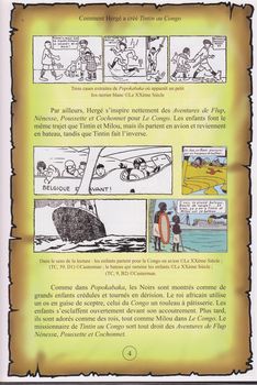 remarques: | dans la série "comment Hergé a créé", tome 1 Tintin au Congo (genre making of) l'album, un parfum de colonialisme inspiré d'un premier récit: les aventures de Popokabaka, le roitelet nègre qui fut publié dans le Petit XXème en 1928 et dans lequel apparait pour la première fois un petit fox-terrier blanc il y eut aussi les aventures de Flup, Nénesse, Poussette et Cochonnet (Petit XXème 1928/1929) tous les deux récits seraient à l'origine des aventures de Tintin tout comme le voyage extraordinaire d'un boy-scout au Congo (dans le boy-scout belge, 1923) documentation Hergé se serait inspiré auprès du musée du Congo, devenu le musée royal d'Afrique Centrale à Bruxelles >> p. 7 la définition des hommes-léopards ainsi que de l'exposition coloniale internationale de Paris (1931) mais aussi d'après des revues tel que - le journal des voyages et le Congo illustré >> p. 13 les couvertures de romans "africains" référence aussi aux illustrations des romans de Jules Verne, aux aventures de Bonzo par Studdy et de Gédéon en Afrique par Benjamin Rabier (surtout pour les animaux) mais Hergé a surtout été influencé par les aventures de Zig et Puce par Alain Saint-Ogan de plus, Hergé s'est inspiré de nombreux films "africains" des années 1920-1930 tel "the jungle goddess" thèmes particuliers pour la documentation - les voyages par bateaux = les malles congolaises, tel le paquebot "le Thysville" - les raids aériens et les lignes ferroviaires du Congo, en fait la seule était celle de Matadi-Léopoldville - l'exploitation du caoutchouc (le crime du Congo) - le trafic des diamants, les médecins de brousse (principalement des missionnaires) - les grandes chasses, le commerce de l'ivoire, le fétichisme, les pygmées sur la question: Hergé était-il raciste? plusieurs tintinologues le réfutent car dessiné dans le plus pur esprit paternaliste selon les critères de l'époque comme commenté dans la plupart des journeaux de ce temps et même la plupart des congolais ne se sentent pas offusqués! >> p. 42 la célèbre marque Banania et son slogan "y'a bon banania" >>> conclusion: Tintin au Congo est à l'image d'une époque et les articles de journeaux d'alors y transposent les mêmes faits participation au récit de l'abbé Norbert Wallez qui démissionne de son poste en 1933, Hergé y gagnera en autonomie à noter: le livre par Arthur Conan Doyle "le crime du Congo" (1910) sur le travail forcé des indigènes à l'époque de Leopold II ex-libris: lettre de Louis Sordes, directeur Bedestory sur l'attitude malveillante de la société Moulinsart concernant la collection "comment Hergé a créé" annexes - 4ème plat du tome 1 Tintin au Congo - une page sur les aventures de Popokabaka - les quatre pages de garde contenus dans les albums (du moins jusqu'au tome 11 Rackham le Rouge) |
