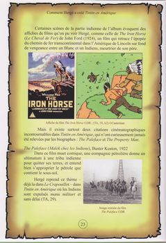 remarques: | - album réalisé dans un contexte fortement anti-américain des années 1920-1930, - les USA considérés commel'autel de la consommation - brouillon de Tintin en Amérique: les aventures de Totor, le boy-scout belge en Amérique (1923) - et dès la fin de Tintin au Congo, celui-ci apprend que sa prochaine mission se déroulera en Amérique la documentation d'Hergé pour Tintin en Amérique provient principalement d'un numéro spécial du Crapouillot en octobre 1930 et du livre "moeurs et histoires des peaux-rouges" par René Thévenin mais aussi du livre "scènes de la vie future" by Georges Duhamel décrivant le "way of life" de la société américaine (trafic automobile, constructions de gratte-ciels, le roi coca-cola, les abattoirs, etc) >> p. 14 dissertation sur le livre de Thévenin (un triste bilan pour les peaux-rouges, description de leur culture) n.b curieusement, le père Gall, un moine-indien, dont la photo est présenté dans la page de titre, n'est pas mentionné dans les commentaires de l'album en Amérique, c'est l'époque de la prohibition (le Volstead Act) - avec les speak-easies = bars clandestins - les bandes de gangsters dont celle d'Al Capone - l'industrialisation et la publicité (les boites de conserve) - les cités et gratte-ciels, la folie de l'or noir, le Far West références de BD pour Tintin en Amérique - la famille Fenouillard (1893) - Bécassine voyage (1921) - les pulp magazines (Jim Kannah, 1919), - les US comics (Dick Tracy, 1931) - Zig et Puce à New York (1930) - référence aussi au cinéma américain (Nick Carter, Tom Mix) et les films de gangsters (little Caesar, scarface) - et les agents de police (keystone cops) - le train occupe aussi une place de choix (iron horse) - en outre, Hergé s'inspire de l'actualité (arrestation d'Al Capone, enlèvement du fils de Lindbergh) n.b. le gangster Georg Moran, dit "Bugs" avec son célèbre sourire représenté dans l'album par Bob Smiles (sourires) - dénonciation aussi du racisme et du lynchage >> p. 34 lors d'une attaque de banque, on a aussitôt pendu sept nègres mais le coupable court toujours! - le scandale des abattoirs (the Meat Inspection Act, 1906) - les différences entre la version N&B et couleur, surtout une affaire (suppression) de noirs - analogie avec le récit de Cuvelier: le canyon mystérieux (sur une idée d'Olav = Jacobs/Hergé) >> Tintin en Amérique marque une étape décisive: Tintin comme détective et justicier et un bon album documentaire de Bedestory avec des illustrations et photos intéressantes annexes - couverture de l'album - doc sur le "iron horse" et la folie de l'or noir |