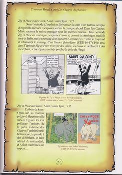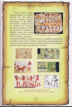 remarques: | Tintin se frotte dans ce récit aux mystères de l'Orient d'abord de l'égyptologie avec présentation des tombeaux des pharaons Séthi Ier, Ramsès II et Toutankhamon, strips qui rappellent des fresque égyptiennes bien réelles puis ce sera la mythologie hindoue avec le dieu Shiva >> p. 12 la fameuse vague inspirée du peintre japonais Hokusaï Hergé s'inspire aussi de nombreux romans populaires sur l'Egypte et les Indes notamment ceux de Paul Ivoi (les 5 sous de Lavarède) dans lequel apparaissent deux policiers imbéciles (Schultze et Muller) qui deviendront les deux Dupond(t) d'abord nommés X33 et X33bis thème du voyage aussi avec référence aux livres - les secrets de la mer Rouge by Henry de Monfreid (trafic d'armes), de Rudyard Kipling et de l'explorateur Richard Burton (voyage à la Mecque, 1873) allusion aussi aux romans 1) d'Agatha Christie, 1926 (pour les énigmes) 2) "la bande de Zigomar" par Leon Sazie (1909) références BD - Zig et Puce aux Indes (1932) et histoire de Babar (Bah-Bahr = Tintin soldat arabe dans la version N&B) références au cinéma: the sheik, the mummy - l'onirisme et le cauchemar font leur entrée, inspirée d'une étude de Sigmund Freud - le cigare marque Flor Fina avec le signe Khi-Oskh à noter: Hergé était un grand amateur de cigares - les exploits des aviateurs sont également à la mode et Hergé ne s'en prive pas (Wings, an epic of the air) - description du sultan Pacha-al-Atrach, un important leader douze en Syrie à cette époque (représenté par Patrash Pacha dans l'album) bien représentés sont aussi les lieux de passage de Tintin sur son itinéraire: Egypte, Mer Rouge, Arabie, Indes thèmes particuliers - le mythe du fakir (qui utilise l'hypnotisme) - la corde magique utilisée par le fakir - la vache sacrée (culte de la vache) - le khoutthar, poignard triangulaire à double tranchant galerie des personnages récurrents - le camelot Oliveira da Figueira - les deux Dupond(t), X33 et X33 bis, ressemblance avec Schultze et Muller, Ike et Mike ainsi que Laurel et Hardy - Rastapopoulos, un non-juif mais au nez prononcé et nom formé de rastaquouère et populos = personne de basse extraction les différences entre version N&B et couleur dont les épisodes des serpents et du charmeur de serpents qui seront supprimés >> dans cet album, Hergé donne libre cours au roman d'énigmes et à la création de nouveaux personnages ainsi qu'un début de documentation important >> un album Bedestory plutôt intéressant annexes - couverture de l'album - la relation avec les fresques égyptiennes dans l'album - les allusions avec Zig et Puce |