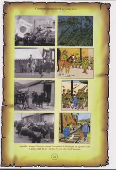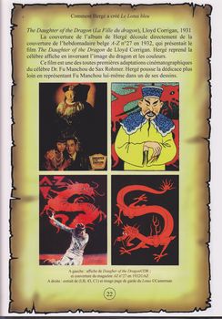 remarques: | rencontre d'Hergé avec Tchang Tcheng Jen le 1.5.1934 qui fournira à Hergé une documentation réaliste de la Chine des années 30 le lotus bleu, la fleur de lotus, apparait déjà dans l'album des cigares du pharaon >> description du lotus égyptien ou nénuphar bleu connu pour ses qualités médicinales Hergé s'inspire bien sûr de plusieurs ouvrages sur la Chine de cette époque dont surtout ceux de Blasco-Ibanez (Chine, 1932), mais aussi de Jules Verne et de Paul Ivoi en outre, les romans d'Albert Londres "la Chine en folie" en 1932 apportent également une importante source d'inspiration Tchang put aussi fournir de nombreux dessins et peintures dont Hergé fera usage à plusieurs occasions dans son récit inspiration aussi par le cinéma, notamment pour la fameuse fausse lettre des Dupond(t) et avec les films "Shanghai express" (1932) et "au bout du monde" (1933) et probablement avec le dr Fu Manchou et son dragon dans le film "the daughter of the dragon" (1931) mais Hergé sera surtout inspiré par l'actualité de l'époque dont - le conflit mandchou (Chine, Japon, traité de Versailles), 1934 - l'incident ferroviaire de Moukden qui accable le Japon - les inondations catastrophiques du Fleuve Jaune, 1931 et les débuts des actualités cinématographiques recherches sur Rawahjapoutalah qui pourrait être Simla au Pendjab ou dans une région proche de Delhi: le Radjpoutana thèmes particuliers - les fakirs - les danseuses (devadasis) - l'éléphant blanc (l'animal le plus sacré en Inde) - la ville de Hou Kou - le temple de Cishou et l'album contient surtout des banderoles et inscriptions en caractères chinois (principalement dues à Tchang) >> p. 34 à 36 traduction des pincipales inscriptions - description de la fameuse concession internationale créée en 1845 à Shanghai (qui veut dire "sur la mer" en chinois) les personnages - Mitsuhirato, caricature du japonais cruel - Wang Jen-Ghié, le "parfait" chinois - Dawson et Gibbons, personnages véreux et corrompus - retour de Rastapopoulos, l'ennemi intime de Tintin et la plus grande différence entre la version N&B et couleur, est sans doute d'ordre esthétique: on regrettera quelque peu les jeux d'ombre et de clairs obscurs de la version N&B >> un très bon album documentaire où Tintin se révèle humain et chevalresque (notamment avec le fils et l'épouse de Wang Jen Ghié) ce sera le tournant d'une oeuvre avec une attitude très anti-coloniale (la Chine oppressée) remarque on comprend quelque peu la réaction de contestation par les studios Hergé envers les éditions Bedestory, sans être bien sûr du plagiat, La Batelière démontre, preuve à l'appui, que les récits d'Hergé s'inspiraient beaucoup de nombreuses autres sources, tant pour le texte que pour les illustrations) annexes - couverture de l'album - Tintin et les dragons - illustrations inspirées de photos de Chine |