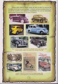 remarques: | préface de Jean-Loup de la Batelière (petite critique à la fondation Hergé, voir information) outre la métaphore politique, cet album regorge de gags et de situations que Hergé n'hésite pas à emprunter à ses créations précédentes, au cinéma, à la littérature ou à ses propres confrères - tels que Geo McManus, Oscar Jacobsson ou Alain Saint-Ogan,. géniaux précurseurs d'un style qui ne porte pas encore le nom de ligne claire nul ne conteste alors ces emprunts, hommages et citations il est vrai qu'à cette époque la création artistique n'est pas encore soumise à la dictature d'avocats cupides et sans imagination et la Syldavie réserve encore bien des secrets et des mystères que nous tenterons de débusquer dans les pages de cet album Tintin confirme dans cet album ses talents d'enquêteur alors que Milou s'intéresse de plus en plus à des os divers documentation sur la sigillographie = étude des sceaux et de l'héraldique = étude des blasons (armoiries = attributs extérieurs) à noter: le magnifique blason de Syldavie >> p. 7 le blason d'Ottokar sources documentaires - dans la version N&B, les gardes syldaves portent le costume des Beefeaters = gardes de la Tour de Londres >> p. 9 échantillon représentatif des voitures d'époque dessinés dans l'album: Ford décapotable 1937, Opel Olympia 1938, LaSalle 1934, Paccka (= Packard) 1938 et Chevrolet 1932 - les années 1937-1938 sont riches en évènements et exploits aéronautiques (Savoia Marchetti SM 73, Stinson R3, Messeschmitt 109) - diverses sources littéraires sont prises en considération, mais particulièrement le livre de Malaparte en 1931 (la technique du coup d'état) - référence BD avec Geo McManus, la famille Illico, 1913 d'où la diva Castafiore aurait pu être tirée - référence au cinéma avec "duck soup" des Marx Brothers où deux pays sont mentionnés: Sylvania et Freedonia mais aussi au film "le prisonnier de Zenda" (1937) - et similitude avec le film "the great dictator" (1940, mais ébauché déjà en 1938) avec Syldavie = Osterlich, Bordurie = Tomania et surtout de par l'amalgame Mussolini/Hitler = Müsstler (Hynkel et Napolini dans le film) actualités - l'annexion de l'Autriche, le pacte d'acier entre les pays de l'Axe. la garde d'acier ou garde de fer en Roumanie - similitude avec la royauté belge et celle de la Syldavie >> p. 25 l'histoire de la Syldavie les rois Ottokar ont réellement existé, le roi Muskar XII (= mentionné Muskar VII par Tintin dans l'album) étant le clone d'Otto von Habsburg >> p. 27 commentaires sur la grammaire syldave, dérivée du dialecte marollien = patois bruxellois - la géographie de la Syldavie (à consonnance sylvestre) correspond à celle de la Roumanie (TranSYLvanie et MolDAVIE) la Bordurie étant la caricature de l'Allemagne nazie de l'époque >> p. 30 les modèles de châteaux n.b. le château de Chillon est mal indiqué, ce devrait être la vignette C1 les personnages - entrée en scène de Bianca Castafiore, très inspirée de Maria Callas toutefois selon Hergé, elle devrait être un souvenir de jeunesse - Nestor et Alfred Halambique, inspirés des jumeaux suisses Jean et Auguste Piccard dont Auguste allait devenir le modèle pour Tournesol - Igor Wagner, le pianiste et Irma, la camériste - l'aide de camp (Boris Jorgen) qui reviendra dans on a marché sur la lune - Wizskizsek (whisky sec?), un comploteur les différences entre les versions N&B et couleur dont la principale: lors de la colorisation de l'album, E.-P. Jacobs réalisa la "balkanisation" de tous les décors, costumes et arrière-plans enrichissant le dessin tout en allégeant certains dialogues clin d'oeil dans la scène de la cérémonie, Hergé se représente avec un grand nombre de ses proches, à savoir: - à gauche: Ginette et Jacques van Melkebeke + Marcel Stobbaerts, un artiste ami d'Hergé - à droite: E.-P. Jacobs, Germaine Kieckens (épouse d'Hergé) et Hergé lui-même ainsi que Paul Rémi, frère d'Hergé (?) n.b. mais le clin d'oeil à ce sujet comme expliqué par La Batelière n'est pas très clair! >> à noter: les 3 Jacques: Melkebeke, Martin et Laudy - le sceptre d'Ottokar est un album prémonitoire qui annonce le prochain: au pays de l'or noir qui sera interrompu par la guerre et par la fermeture brutale du Petit XXème >> curieusement dans cet album, La Batelière compare les photos réelles avec des illustrations du dessin animé mais sans aucune vignette de l'album sceptre d'Ottokar à partir de l'année 2011, les vignettes de l'album seront à nouveau reprises et ceci dû peut'être aux désaccords avec la fondation Hergé qui seront probablement juridiquement résolus par les tribunaux pour les prochains albums dès 2011 >> explications voir le copyright dans la page de titre mais en général un bon album explicatif par Bedestory, toutefois l'album passe de 45 pages à 37 pages (conséquence des problèmes avec la fondation Hergé?) avec une augmentation de Euros 18,90 à Euros 25.- annexes - couverture de l'album - le blason d'Ottokar - les modèles automobiles Information copyright les textes extraits de l'oeuvre de Hergé cités dans cet album sont la propriété exclusive de Moulinsart S.A. ou fondation Hergé ou édition Casterman et sont cités ici à titre de référence et d'exemple dans le strict respect de la législation sur le droit de courte citation les images des dessins animés de Tintin montrées dans cet ouvrage sont tirées des adaptations réalisées par Ellipse-Nelvana en 1991 sur lesquels la société Moulinsart ne détient aucun droit, conformément à la jurisprudence en vigueur de même, conformément à la jurisprudence en vigueur, la société Moulinsart ne détient aucun droit sur les couvertures du Petit XXème ces différents éléments (images de dessins animés et couvertures du Petit XXème) sont montrés ici dans l'unique but d'illustrer le propos de l'auteur pour rappel, l'accusation de Moulinsart contre Bedesto