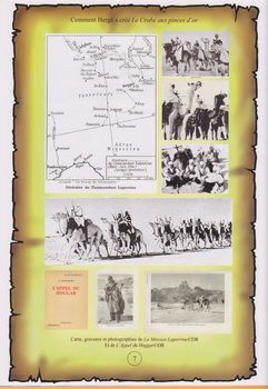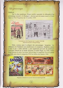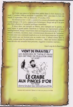 remarques: | le 5.9.1940 Hergé, après la disparition du Petit XXème, est engagé par le journal Le Soir dirigé par Raymond de Becker et sous contrôle de l'occupant Hergé rédige ses récits dans le nouveau Le Soir Jeunesse qui remplace le Petit XXème et qui débute le 17.10.1940, mais le 23.9.1941 le supplément disparait et l'histoire se continue en strips quotidiens très petits dans Le Soir (on n'en connait pas les raisons, manque de papier) avec ce changement, Hergé devra livrer un strip par jour dans le journal Le Soir tout en accrochant le lecteur à chaque fin de ligne le crabe aux pinces d'or sera donc publié du 17.10.1940 au 3.9.1941 dans Le Soir Jeunesse et du 23.9.1941 au 19.10.1941 dans le journal Le Soir en entrant au Soir "volé" soumis à la censure allemande (qui interdit à cette époque "l'île noire" supposé pro-britannique), Hergé sait qu'il ne peut plus faire allusion à l'actualité politique immédiate n.b. si l'île noire paru dans le Petit XXème en 1937/1938 avec un album N&B paru en 1938 et un album couleur paru en 1943 malgré l'interdiction allemande, le sceptre d'Ottokar paru en 1938/1939 (dernière parution dans le Petit XXème) et en album N&B en 1939 mais en couleur seulement en 1947 ne semble pas avoir été inquiété par la censure allemande ceci reste un peu inexplicable! Tintin se retrouve encore une fois comme détective (cette fois concernant de l'opium dans des boites de conserve) documentation 1) technique avec l'hydravion Ballanca 31-42 Pacemaker et le cargo Glengarry Glasgow préfigurant le Karaboudjan (karaboudja = gribouillage dans le patois bruxellois) 2) géographie récits de voyage et essais concernant le Sahara, l'histoire des méharistes avec plusieurs références littéraires dont l'indémodable "Atlantide" de Pierre Benoit (1919) et un titre opportun: "le pays de la soif" by Gavard (1938) ainsi que "l'escadron blanc" by Peyré (1931) et même certains jurons d'Haddock proviennent de revues littéraires (tel Bagatelle) >> p. 15 les photographies de Paris Match (1939) sur le Sahara et les méharistes par contre les références au cinéma sont moins fournies avec toutefois de nombreux titres concernant le Sahara: >> p. 22 la bandera, la casbah, Pépé le moko, SOS Sahara, etc actualités à nouveau référence à de la fausse-monnaie au début de l'album, puis à de la drogue mais alors que le Japon n'est pas encore entré en guerre, le japonais Kuraki à la fin de l'album n'est pas considéré comme un ennemi, mais comme allié et victime images du Maroc la ville de Bagghar (bagarre), ressemblant à Casablanca et les forts méharistes d'Aoulef, Colomb-Béchar et Bourem dans les années 30 les personnages - entrée en scène d'un grand personnage: le capitaine Haddock (similitude avec cap'tain Sabord by Rigal dans Pierrot, 1928 et Wrill, 1940) >> p. 29 les origines possibles du nom d'Haddock (la plus pausible est celle mentionnée dans le film "les 39 marches" d'Hitchcock soit "do you like haddock" (haddock étant le nom d'un poisson) - Allan Thompson au nez écrasé de boxeur - madame Pinson, concierge de Tintin - Omar Ben Salaad, portant l'insigne du crabe aux pinces d'or n.b. les modifications dans les albums couleur durant les années 50 pour la publication sur le marché américain seront assez conséquentes: certains jurons seront modifiés, les noirs sont remplacés par des blancs et surtout dans la chaloupe, Haddock ne boit plus au goulot - l'introduction hasardeuse du capitaine Haddock va bouleverser le destin de la série; dès lors, on pourrait dire que ce ne sont plus uniquement les aventures de Tintin et Milou mais celles de Tintin et du capitaine Haddock! >> un album Bedestory assez intéressant, surtout pour les illustrations se référant à l'album Tintin, toutefois celles-ci sont encore comparées aux images du dessin animé (au lieu de celles de l'album) et les problèmes avec la fondation Hergé n'étant peut'être pas encore complètement résolus, elles le seront à partir des album Bedestory édition 2011 annexes - couverture de l'album - publicité pour la parution du crabe aux pinces d'or - l'allusion au cap'tain Sabord - documentation sur les méharistes |