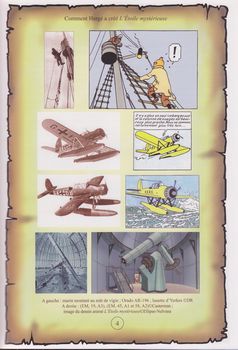 remarques: | n.b. dès l'édition 2011, les albums Bedestory passent de 37 pages à 29 pages mais le prix reste avec Euros 25.- comme affiché au 4ème plat une aventure scientifique au rythme soutenu avec la malédiction de l'araignée, hallucinations n.b. l'étoile mystérieuse sera le premier album édité en couleur documentation - le navire Aurore inspiré du bateau allemand "Schwabenland" qui pouvait catapulter un hydravion, en l'occurence un Arado AR-196 - et pour la partie scientifique, Hergé reçoit les conseils (représentation spectographique, astéroïde) de Bernard Heuvelsmans, humaniste bien connu, engagé par Le Soir "volé" tout comme Jacques Melkebeke qui travaille au côté d'Hergé les influences littéraires sont nombreuses dont principalement: - Jules Verne pour l'astronomie, les romans: "chasse au météore" et "Hector Sevadac" dans lequel une planète doit heurter la terre ainsi que la mention du gag de l'araignée dans le téléscope - Magog pour son livre "l'île tombée du ciel" (1923), île sur laquelle poussait une végétation de croissance rapide tels les champignons de l'étoile mystérieuse peu de référence cinématographique sauf peut'être "la fin du monde" by Abel Gance (1930) actualité - l'Europe en 1942, guerre et bombardement (la fin du monde?) - l'expédition du FERS (fonds européen de recherches scientifiques) se met en place avec des membres de pays neutres ou plus ou moins amis de l'Allemagne car les américains dans cet album sont maintenant les adversaires du FERS avec un navire concurrent, le Peary battant pavillon américain >> p. 14 pris comme modèle, l'expédition allemande 1938/1939 en Antarctique avec le navire Schwabenland et son hydravion images de Belgique et du grand nord - l'observatoire qui est copié sur celui d'Uccle - l'escale en Islande - la position de l'astéroïde sur la côte nord du Groenland les personnages - Hippolyte Calys, savant belge, chef de l'expédition - les autres membres: le suédois Björgenskjöld, le suisse Paul Cantonneau, l'allemand dr. Schulze, le portugais Dos Santos, l'espagnol y Calamares qui tous conviennent à la censure allemande - le prophète-fou Philippulus qui ressemble peut'être à maître Zacharius du roman de Jules Verne - le banquier juif Blumenstein et non mentionné par La Batelière: le capitaine Chester du Sirius l'album édité en 1942 subit quelques modifications dès 1954, principalement: - le drapeau américain qui deviendra celui du Sao Rico - le banquier juif Blumenstein verra son nom changé en Bohlwinkel (bollenwinkel = en patois bruxellois: magazin de bonbons) n.b. c'est ce portrait de Blumenstein qui vaudra à Hergé d'être taxé d'antisémitisme - le capitaine Haddock dans cet épisode sera attitré de président de la L.M.A. (ligue des marins antialcooliques) clin d'oeil - petite apparition des Dupond(t) non présents dans l'album et de Quick et Flupke au départ de l'Aurore (p. 20) - les caramels mous offerts par Hippolyte Carlys, Hergé rend quelque peu hommage à son ancien chef, l'abbé Norbert Wallez, qui adorait les caramels mous et en proposait à ses invités - thème aussi de la malédiction de l'araignée, parait-il un mauvais signe (querelles, procès, pertes financières) à noter: en 1942, Hergé et Van Melkebeke mettent en scène avec Tintin une nouvelle pièce de théâtre policière cette fois: "monsieur Boullock a disparu" dans lequel Tintin à la recherche de Boullock voyage à travers le monde >> la première pièce de théâtre en 1941 avait été "le mystère du diamant bleu ou Tintin aux Indes" >>> un album Bedestory toujours assez intéressant malgré le nombre de pages réduit (29 pages) annexes - couverture de l'album - les modèles d'hydravion - doc sur le banquier juif new-yorkais (Blumenstein devenu Bohlwinkel) |