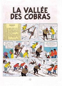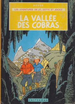 remarques: | édition B32 de 1962, dos jaune, page de garde aux damiers rouge et blanc "ce livre appartient à" 4ème plat Tintin au Tibet n.b. il y eu plusieurs rééditions, l'édition originale étant datée de 1957, B20, dernier titre l'affaire Tournesol, mais les couvertures d'album ne changent pas dans les rééditions l'action se déroule dans le pays de Gopal (région proche du Cachemire), Jo et Zette avec leurs parents sont en vacances en Haute-Savoie dans le village de Vargèse à l'hôtel des Neiges (le même village que dans Tintin au Tibet) rencontre orageuse avec l'irritable maharadjah de Gopal et son ministre Badalah pseudo vol du collier de perles du maharadjah, l'obsession de la bastonnade, son altesse éconduit par Legrand senior mais après explication, Legrand acceptera de construire un pont moderne dans le pays de Gopal, il aura toutefois à faire aux deux traîtres: le premier ministre Romahyonna et le fakir Rabindah >> p. 21 la philosophie des traîtres >> p. 22 photo de famille et spectacle manqué >> p. 27 toujours le problème des vaches sacrées >> p. 30 la vengeance des dieux est humaine >> p. 35 la partie de jokari avec le maharadjah >> p. 36 premier attentat sur l'ingénieur Legrand >> p. 37 le chagrin du maharadjah >> p. 44 des cobras attirés par le whisky >> p. 47/48 le chef des bandits qui n'est même pas désarmé reçoit le pardon du père Legrand >> p. 52 les affaires restent les affaires n.b. dans les aventures de Tintin, Bianca Castafiore se réfère parfois au maharadjah de Gopal comme une de ses relations >> un album intéressant avec un scénario plutôt original et quelque humour, toujours un bon graphisme cet album est conçu dans le style des dernières aventures de Tintin, on y trouve toutefois l'archétype des attitudes masculines et féminines, tant chez les enfant que chez leurs parents, là encore à la différence des aventures de Tintin qui lui n'a pas de parents et évolue dans un monde quasiment sans femmes information sur la demande du périodique catholique "coeurs vaillants", Hergé commenca cette série comme palliatif pour les aventures de Tintin (Jo et Zette font partie d'une famille chrétienne alors que Tintin est célibataire et donc plus libre et sans engagement) toutefois, le scénario avec les parents devenant peu attirant pour Hergé, ce volume fut le dernier de la série malgré que les aventures de Jo et Zette connurent les faveurs de certains lecteurs et que leurs aventures furent régulièrement rééditées annexes - Ier et 4ème plat de l'album - première page de l'album - un cobra pure race |