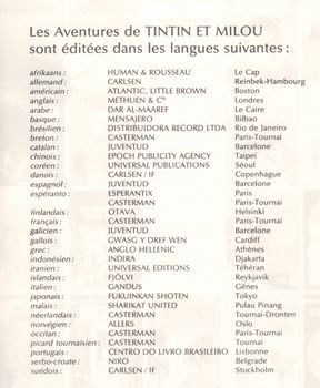 remarques: | 50 questions pour chaque album tome 2 des 7 boules à Tintin chez les Picaros 11 albums au total quelques 1100 questions >> parfois les questions sont très pointues (avec dates et divers numéros) et devenant assez vite lassantes, car pas toujours en relation directe avec les aventures de Tintin annexes - couverture du tome 2 - liste des albums Tintin édités en 32 langues dont: afrikaans, basque, breton, catalan, esperanto, galicien, gallois, occitan, picard tournaisien et serbo-croate n.b. curieusement la langue hébreue n'est pas mentionnée mais a aussi été éditée en 1964, par la suite il y eut aussi des éditions en patois dauphinois, en patois bernois (dialecte suisse), coréen, hongrois, araméen, vietnamien, estonien, khmer, tchèque, thaï, hindi, luxembourgeois, roumain, albanais, slovaque, écossais, irlandais, polonais, russe, turque, slovène, mongol, tibétain en wolof du Sénégal et encore peut'être bien d'autres non connues |