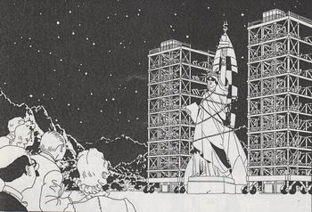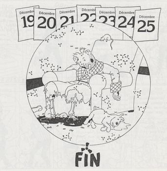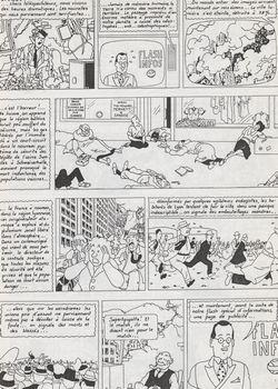 remarques: | édition originale en N&B, tome 2 (1988), 66 pages - préparatifs d'émigration, lutte de vitesse entre américains et soviétiques où chacun essaie de saboter la fusée de l'autre, - Rastapopoulos est le pape Jean-Rastapol II, - Tintin et Haddock vont se réfugier en Suisse où ils sont parfois quelque peu maltraités >> p. 17 "il a dû nous prendre pour des réfugiés" dixit Tintin à Haddock dans le hall de l'hôtel Cornavin; >> p. 17 le jet d'eau de Genève = la huitième merveille du monde >> p. 28 mort des deux Dupond(t) (ce que Hergé n'aurait jamais osé faire) - >> p. 31 l'humour avec la statue de la liberté ficelée sur la fusée américaine - ce n'est pas la fin du monde, ce n'est qu'un inoffensif tremblement de terre (allusion à l'étoile mystérieuse) - la fusée soviétique explose en vol, la fusée américaine s'écrase sur un astéroïde - >> p. 52 l'église vaticane est bafouée - par erreur, Haddock fait donation de Moulinsart à Nestor et Archibald Haddock devient le nouveau domestique de Nestor - fin du récit mort de Tintin et Milou (une mort peu ragoûtante après toutes ces catastrophes) >> à nouveau une intéressante parodie, avec un bon texte satirique sur l'actualité dont critique de la religion, également une chronique des évènements les plus importants des aventures de Tintin annexes - couverture de l'album - autre couverture - la fusée lunaire - une page catastrophique - confrontation Ranko/Bretecher - la mort de Tintin |