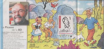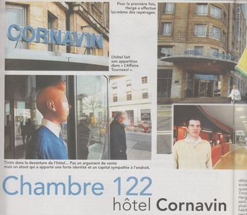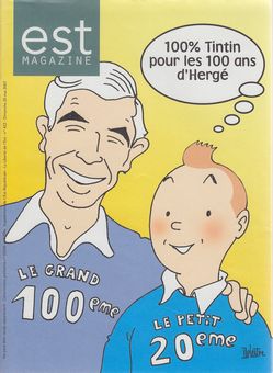 remarques: | numéro spécial de mai 2007, supplément au journal Est Républicain en hommage à Hergé qui aurait eu 100 ans en 2007 - Hergé 007 dessinateur des jeunes de 7 à 77 ans un hommage rendu avec divers petits articles sur Tintin dont principalement: - les timbrés de Tintin (les collectionneurs) - la maison de retraite Moulinsart - Tintin et Hergé vus par divers dessinateurs - l'association Tintin en Lorraine - une famille de tintinophiles - les familles Haddock dans le monde (la plupart des Haddock provenant du pays de Galle) - les albums Tintin en patois des Vosges - les films sur Tintin (dont ceux avec Jean-Pierre Talbot) n.b. il fallut teindre 7 chiens en blanc, car les fox terrier blancs sont rares - les anciens disques sur Tintin dont celui sur le sceptre d'Ottokar - visite à l'hôtel Cornavin de Genève, chambre 122 de Tournesol (mais une erreur d'Hergé car à cette époque l'hôtel ne comportait que 120 chambres) >> quelques petits articles intéressants sur Tintin dans ce périodique spécial lorrain intitulé le grand 100ème et le petit 20ème annexes - couverture du magazine - réunion de famille au EMS Moulinsart - Hergé dessiné par le créateur de Sylvain et Sylvette - hôtel Cornavin chambre 122 |