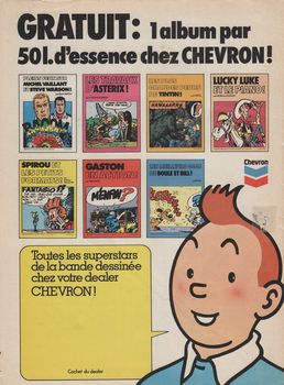 remarques: | album publicitaire édité par Chevron reprend certains passages dans les albums de Tintin qui ont causé quelque frayeur à Tintin - Tintin au Congo: Tintin poursuivi par un éléphant - Tintin en Amérique: la lutte contre Al Capone et ses gangsters - temple du soleil: Tintin sur le bûcher - l'île noire: l'accident avec la caravane (n.b. le combat avec le gorille Ranko aurait été plus approprié) - le sceptre d'Ottokar: la chute sans parachute (n.b. le chant de la Castafiore dans la voiture aurait été plus approprié) - le secret de la Licorne: combat contre Rackham le Rouge (n.b. mais Tintin n'y a rien à faire) et bien sûr Tintin au Tibet façe au yéti (la vraie peur de Tintin) n.b. en page 18, curieusement un pavillon anglais flotte sur la poupe du navire la Licorne (on se demande de quel album est tiré cette vignette) >> petit album publicitaire sans valeur littéraire, copie sans modification de certains passage des albums de Tintin, mais une bonne qualité d'impression, une brochure de collection annexes - couverture du magazine Chevron - les différents pavillons de la Licorne - 4ème plat avec liste des éditions Chevron dont celle particulièrement à retenir: les 12 travaux d'Astérix |