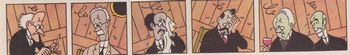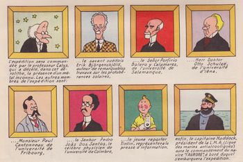 remarques: | - au début des années quarante, le professeur Calys embarquait, avec cinq autres scientifiques, un jeune reporter belge et un capitaine au long cours, à bord du navire polaire "l'Aurore", - le but de l'expédition: retrouver la fameuse "étoile mystérieuse" tombée dans l'océan Arctique et prélever un fragment du précieux calystène, métal inconnu sur terre plus de soixante ans plus tard, voici enfin, reconstituées avec minutie, la rigueur scientifique et (surtout?) la fantaisie que requiert une telle publication, - la vie et l'oeuvre de ces six savants 8 membres dont 6 scientifiques de l'expédition Carlys dans l'Arctique de 1941-1942 sur le navire "Aurore" 1/ Hippolyte Calys 1877-1953 - penchant immodéré pour les caramels mous, maîtrise en mathématiques, puis devient astronome à l'observatoire royal de Bruxelles - découvre sur un aérolithe tombé du ciel, un nouveau métal qui sera appelé calystène - mais ce serait son assistant Mesplède, mis à l'écart, qui aurait découvert le premier l'aérolithe grâce à une photographie spectrographique, ce sera le début de l'affaire Mesplède - de plus, Calys sera accusé d'avoir collaboré avec l'occupant (n.b. peut'être une petite référence à Hergé?) - Calys écrira de nombreux ouvrages dont entre autres: - Raadeubibl lotec, un dieu totonaque oublié 2/ Erik Björgenskjöld 1906-1996 - sujet suédois, devenu un spécialiste mondial des protubérances solaires - invité par le prof. Calys de par ses travaux sur l'astre solaire - un des ses ouvrages connus: - le kajak, ethnosociologie d'un palindrome flottant (palindrome = mot qui peut se lire de doite à gauche et inversement) 3/ Porfirio Boleroy y Calamares 1890-1969 - sujet espagnol, professeur de chimie - auteur de plusieurs ouvrage dont des romans policiers tel que "el horror boreal" ainsi que des poèmes comme "rimes stoechiométriques érotiques" 4/ Otto Schulze 1903-? - sujet allemand, né à Berchtesgaden, décoré de la croix de fer par le Führer - la présence de ce scientifique aurait été imposée à Calys par l'occupant, il n'a aucune connaissance d'astronomie - il n'est que vétérinaire avec comme spécialité: la médecine et pathologie porcine - auteur d'ouvrages relativement médiocres tel que l'étude de la pathologie de l'appareil respiratoire des suidés (porcins) domestiques 5/ Paul Cantonneau 1895-1945 - né en Belgique, étude en Suisse, puis acquiert la nationalité helvétique et devient professeur en géologie à l'université de Fribourg, membre de l'expédition de par son amitié ininterrompue avec le prof. Calys - aucun degré de parenté avec Félix Cantonneau de l'expédition Sanders-Hardmuth - auteur de plus de 170 écrits recensés se rapportant en grande partie à la géologie, les plus connus: - le métamorphisme ou l'art de faire mijoter la pierre - Porphyre et Molybdène, les frères ennemis (roche magmatique et élément chimique) - la caillasse totale (pierraille)) 6/ Pedro Joas dos Santos 1902-1947 - sujet portugais, étude à Coimbra où il devient un physicien de premier plan, spécialiste des métaux radio-actifs - auteur d'un ouvrage en deux volumes consacré au calystène: a) quand le métal hurle, assourdissantes propriétés du calystène b) quand le métal hoche, étourdissantes propriétés du calystène >> une bio-bibliographie assez adéquate (édition ADK), humoristique, originale mais sans grande prétention et sans aucune illustration annexes - couverture de l'album - les 8 membres de l'expédition Calys - les 6 scientifique atteints du mal de mer |