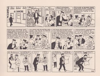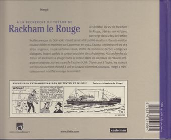 remarques: | titre complet: à la recherche du trésor de Rackham le Rouge - le véritable trésor de Rackham le Rouge, créé en noir et blanc par Hergé dans le feu de l'action feuilletonesque du Soir volé, le premier strip démarre le 19 février 1943, n'avait jamais été publié en album et dans la version couleur éditée et imprimée par Casterman en 1944, l'auteur a réorchestré les 183 strips originaux, coupé certaines cases, étoffé de nombreux décors, corrigé les dialogues, lissant parfois la saveur populaire des phylactères - à la recherche du trésor de Rackham le Rouge invite le lecteur dans les coulisses de l'oeuvre intégrale et originale, sur les traces de l'authenticité - d'une case à l'autre, les auteurs ont minutieusement cherché à voir et à savoir comment, pourquoi Hergé a méticuleusement modifié le visage de son récit - publié dans le Soir du 19.2.1943 au 23.9.1943 avec 183 strips et avec la refonte de trois albums (île noire, crabe aux pinces d'or et secret de la licorne), Hergé, à 36 ans, est au sommet de sa gloire dès 1944, E.-P. Jacobs viendra le seconder - malgré la pénurie de papier, ces strips constituent pour les belges la seule tranche de rêve en ces instants de tragique réalité - avec Rackham le Rouge, qui voit apparaître Tournesol, Hergé fournit aux lecteurs une bonne dose d'exotisme coloré (bien qu'encore en noir&blanc) - cet album est aujourd'hui encore le best-seller des aventures de Tintin - cet album présente la lecture de ces strips tels qu'ils ont été publiés en rajoutant sur la page opposée des comparaisons avec l'édition couleur modifiée y compris quelques autres anecdotes préface par Frédéric Soumois - ce récit exceptionnel est fondé sur une double utopie et sur la cristallisation d'une famille autour de Tintin première utopie: c'est la navigation dans une mer inconnue vers l'île mystérieuse deuxième utopie: le château de Moulinsart, inspiré de celui de Cheverny, mais dont le nom provient du village brabançon au nom inversé Sart-Moulin >> p. 38 à noter que le portugais sera la première langue étrangère parlée par Tintin >> p. 43 sur les bérets des Dupond(t), l'appartenance au Redoutable sera supprimée par la suite (toutefois encore mentionné dans les premières éditions couleur) >> p. 44 certaines planches du sceptre d'Ottokar ayant été perdues lors de leur expédition à Coeurs Vaillants, Hergé devra redessiner entièrement plusieurs planches - en mars 1943, tous les albums de Tintin étaient déjà épuisés et Hergé, accaparé par les strips du quotidien bruxellois, dessinait sept jours sur sept >> p. 89 une des dernières cases dans l'oeuvre d'Hergé où Milou s'adresse directement au lecteur (p. 38 EO = édition couleur)et c'est aussi à la même page que l'on voit pour la première fois Tournesol avec sa pendule qui indique (toujours) "à l'ouest" >> p. 56 en mars 1943, tous les albums Tintin en N&B (huit) sont déjà épuisés >> p. 93 (p. 41 EO), premier juron du genre "bougre d'extraits de crétins des Alpes" >> p. 97 (p. 45 EO), Haddock boit du rhum au goulot sans être censuré cette fois >> p. 101 (p. 45 EO), une expression peu usité depuis Tintin au Congo: mon dieu! >> p. 115 3 cases qui seront supprimées dans l'édition couleur >> p. 129 l'achat de Moulinsart et p. 133 le miracle de la croix de l'aigle >> p. 135, dernière planche, dans la salle de marine, petite différence entre la version N&B une maquette de la licorne avec l'édition couleur où les trois maquettes sont réunies >> un petit album d'archives à première vue, il n'y a pas beaucoup de changement entre la version noir&blanc et la version couleur et pourtant à y regarder de plus près, on peut quand même discerner de nombreuses modifications que Hergé a effectuées dans l'album couleur avec l'idée surtout d'embellir le graphisme annexes - couvertures Ier et 4ème plat de l'album - les 3 premiers strips parus dans Le Soir |