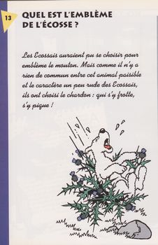 remarques: | dans la collection: les carnets de route de Tintin - dans l'Antiquité déjà, l'Ecosse avait été visitée par des marins grecs et phéniciens, notamment les Cornouailles (Cornwall) d'où était tiré le zinc - à l'origine, l'Ecosse était couvert d'une calotte glacière avec de longs bras de mer (les firth) alors que les lacs encaissés étaient baptisés les "loch" - Ecosse veut dire pays des Scots, peuple gaélique venu d'Irlande, un peuple voisin étaient les Pictes istallés dans le nord, l'Ecosse se faisait aussi appeler la Calédonie par les celtes qui subirent l'invasion romaine - les vestiges des deux murs (Hadrien et Antonin plus au nord), élevés par les romains pour se protéger des barbares, existent encore - les écossais font partie de la Grande Bretagne, mais ne sont pas anglais et en les combattant vers 1328, les écossais conclurent même une alliance avec la France - en 1707, l'Ecosse soumise fusionna avec l'Angleterre donnant alors naissance au Royaume Uni - les Lowlands (basses-terres) ont subi l'influence des anglo-saxons alors que les Highlands (hautes-terres) sont restés fidèles aux traditions celtiques - la répression du duc de Cumberland provoqua une émigration massive vers le Canada et l'Australie - au VIème siècle, Scots et Pictes s'unirent pour se défendre des invasions vikings - les Highlands restèrent catholiques alors que les Lowlands choisirent l'Eglise presbytérienne, guerres de religion entre le puritain Cromwell et les partisans catholiques des rois d'Ecosse >> p. 23 l'histoire des souverains d'Ecosse dont la famille des Stuart à qui appartenait la reine Marie Stuart, et aussi Robert Bruce qui proclama l'indépendance avec le héros écossais sir William Wallace sans oublier la figure légendaire de Rob Roy de Walter Scott - Edinburg, littéralement le château d'Edwin, bâti vers 1000 AC, avec le palais Holyrood et le tattoo = la grande parade militaire au son des cornemuses - les îles d'Ecosse: les Hébrides, les Orcades, l'île de Skye, les Shetland (avec la laine la plus mondialement connue), et au nord d'Inverness se situe une presqu'île surnommée l'île noire! (Black isle peninsula) - la légende du Loch Ness et même s'il n'y a pas de monstres, la région vaut le détour - l'Ecosse a la météo la plus instable avec le point de rencontre de deux climats: a) le Gulf Stream venant de l'ouest et b) à l'est des vents froids venant de Norvège d'où peut'être l'expression "douche écossaise" - l'Ecosse est aussi connue pour son whisky single malt (dont le meilleur viendrait de la rivière Spey au coeur des Highlands) toutefois à l'origine ce sont les irlandais qui ont inventé leur "whiskey" >> p. 33 la recette du whisky (orge, eau pure, germination, chauffage et broyage des grains dont il sort un moût qui après plusieurs distillations donnera le whisky) - l'emblème de l'Ecosse: le chardon (avec la bruyère et le mouton à tête noire) - la cuisine est originale mais typiquement écossaise le haggis = estomac de brebis farci (tripes, rognons, oignons, farine d'avoine), la marmelade d'orange et les scones = petits gâteaux - les châteaux écossais sont en grand nombre, il est dit que l'Ecosse compte autant de châteaux qu'il y a de poils sur le dos d'une vache! les plus célèbres: Eilean Donan, Stirling, Inverary, Dunvegan (Skye), Dundee, Dunottar Castle et celui de Glamis qui serait hanté - avec la cornemuse (4 tuyaux) utilisée par les bardes gaéliques, on découvre la musique locale, mais elle était aussi employée au combat de par ses puissantes sonneries qui étaient censées impressionner l'adversaire - la réputation de grippe-sous des écossais: lors de la guerre contre les anglais, les écossais devaient survivre et être économe était alors vital (d'où peut'être leur réputation d'avarice), mais en général l'écossais a un bon sens de l'hospitalité - les clans dont l'origine est très lointaine = grande famille ou parti avec sa hiérarchie dont le chef est appelé laird - le tartan (ou tissu écossais) était le meilleur moyen pour distinguer les clans il y a encore une cinquantaine de clans à travers le pays - le kilt, c'est le costume traditionel, c'est une jupe de laine ornée de motifs à carré portée jusqu'aux genoux accompagnée de hautes chaussettes avec parfois une bourse, une veste, un béret et un dirk (= poignard écossais) - le tweed = tissu de laine très épais et chaud qui résiste au vent, à la pluie et au froid la laine du mouton black-head donne le fameux Harris tweed - la seconde ville d'Ecosse est Glasgow, première ville industrielle du monde grâce à la machine à vapeur de James Watts, elle était riche et prospère, mais elle fut longtemps une ville de pollution et de misère ouvrière - le Pub = public house, genre de club populaire en Ecosse où l'on vient souvent y savourer bière ou whisky - le public bar où l'on boit debout au comptoir - le lounge bar, plus intime et confortable où se réfugient quelques femmes, car le pub c'est souvent une affaire d'hommes - les écossais furent de rudes marins dont Alexander Selkirk qui inspira Daniel Defoe pour son Robinson Crusoe, d'autres grandes personnalités écossaises: Robert-Louis Stevenson, Arthur Conan-Doyle, Walter Scott, Barrie le créateur de Peter Pan et entre autres: McAdam comme explorateurs: Livingstone et Mackenzie - le charbon et la tourbe furent longtemps les matières utilisées pour se chauffer et par l'industrie (la tourbe entre aussi dans certaines fabrications du whisky lors de la fermentation) les chiens: - Milou est un fox-terrier plutôt anglais, ses cousins sont le Scottish-terrier aux longs poils (marque du whisky black and white), - le colley (Lassie) et de nombreux autres il y a aussi le Scottish fold (chat écossais) et le boeuf de race Angus (fameux pour sa viande) - les sports écossais sont variés dont le lancer du tronc d'arbre (tossing the caber), mais c'est aussi le pays du golf où 