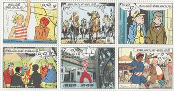 remarques: | hommage, 9 timbres pour le 9ème art, 1989-1999 10ème anniversaire du centre belge de la bande dessinée exemplaire numeroté 2324 sur 2500 exemplaires contenu y compris le feuillet de 9 timbres émis en hommage à huit grands dessinateurs belges disparus et en l'honneur du 10ème anniversaire du CBBD - Paul Cuvelier, 1923-1978, en quête d'absolu - Jijé, 1914-1980, le père généreux - Maurice Tillieux, 1921-1978, le capitaine des copains - Mitacq, 1927-1994, Balou chic type - Jacques Laudy, 1907-1993, le maître des couleurs - Vic Hubinon, 1924-1979, le ciel rouge - Fernand Dineur, 1904-1958, le vagabond détective - Sirius, 1911- 1997, coureur d'étoiles - centre belge de la bande dessinée (CBBD) 1989-1999 n.b. curieusement le timbre Tintin n'est pas vraiment mentionné sauf en dernière page où l'on peut voir un timbre tintin (pas plus que Jacobs d'ailleurs et d'autres dessinateurs tel Macherot, mais timbres qui ont été édités séparément) annexes - couverture du livre - la série de timbres sur une partie des auteurs ci-dessus - deux séries sur Tintin |