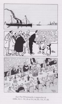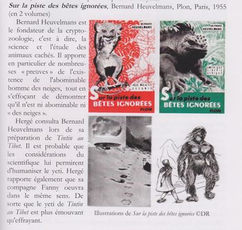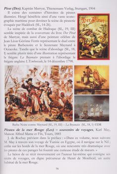 remarques: | le but de cet ouvrage est de recenser les principales sources littéraires d'Hergé, le terme "littéraire" étant pris au sens large, englobe les livres (romans, études, biographies, etc), les histoires illustrées, les bandes dessinées ainsi que les articles de presse, les revues, etc - deux ouvrages préfigurent principalement les aventures de Tintin: a) "Moscou sans voiles" de Joseph Douillet (1928) b) l'épouse du soleil et la vierge du soleil pour le temple du soleil mais au delà de l'inventaire bibliophile, cet ouvrage montre surtout comment Hergé a réussi à intégrer avec génies des sources et influences disparates, souvent déroutantes dans un univers cohérent, original et personnel (ce qui précède représente les notes de l'éditeur et l'inventaire qui suit ne représente pas les ouvrages sur Tintin/Hergé, mais les oeuvres sur lesquelles Hergé a pu se référer) A) le classement de ces oeuvres de référence s'établit par ordre alphabétique, ci-après les principaux: - almanach de l'Action française (1929) dont est issu le fameux canular avec la Poldévie (lotus bleu) - Annapurna (regards vers l') by Maurice Herzog, 1950 (Tintin au Tibet) - araignées (les), film et roman de Fritz Lang (1920) mais pas pour l'illustration dessinée dans l'étoile mystérieuse - l'Astronautique by Alexandre Ananoff, 1950 (objectif lune) - Bécassine, notamment la série de Pinchon qui avait envoyé Bécassine "aux Amériques" en 1921 n.b. pour la petite histoire, il semble que Hergé reprocha à Joseph Gillain d'avoir calqué son pseudonyme J.G. sur celui de Hergé R.G., mais Hergé reprocha surtout à Jigé d'avoir plagié Tintin pour son personnage de Jojo, Jigé avait répondu à cette critique par trois dessins représentant la Bécassine de Pinchon qui, dépouillée de ses cheveux et de sa coiffe, ressemblait étrangement à Tintin, Jigé rappelait ainsi à Hergé qu'il n'existe pas de création ex nihilo et que tout auteur subit des influences, conscientes ou non; l'affaire en resta là, mais elle attira l'attention des biographes sur la filiation de Tintin et de Bécassine rappelant que Pinchon avait dessiné quinze albums avant 1929 et que Bécassine était allée "aux Amériques" avant Tintin et y avait aussi rencontré des indiens avant Tintin et, comme Tintin plus tard, elle s'était elle aussi emmêlée les pieds dans son lasso >> p. 13 pourquoi Jigé au lieu de Jijé? - Câbles et reportages, by Albert Londres (lotus bleu) n.b. Hergé citait volontiers ce grand reporter comme source d'inspiration de Tintin, c'est à Shanghai qu'Albert Londres effectua son dernier reportage en 1932 au plus fort de l'attaque japonaise - chasse au météor de Jules Verne, 1901 (étoile mystérieuse) >> voir aussi le livre Tintin chez Jules Verne by Tomasi+Deligne, 1998 - Claudius Bombarnac de Jules Verne, 1890 Claudius Bombarnac est journaliste dans un journal qui porte le nom prémonitoire de XXème siècle! il part en mission en Chine (lotus bleu) - collection Patrie, éditions Rouff, 1917-1920 qui proposaient de petits romans populaires avec de fort jolies couvertures dont la collection Tallandier Bleu - Crapouillot, dans les années 1920-1930, cette revue a joué une grande importance dans la création de l'oeuvre d'Hergé, notamment le numéro spécial d'octobre 1930 avec un reportage sensationnel intitulé "les américains" (circulation automobile, bandits de Chicago, les abattoirs de Chicago, la loi de Lynch, etc) - découverte de la tombe de Toutankhamon et sa malédiction by Howard Carter en 1922 (cigares du pharaon et les 7 boules de cristal) - destination moon, film américain de 1950 dont Hergé s'est bien inspiré - l'épouse du soleil by Gaston Leroux, 1912 (temple du soleil) Hergé disait de cet ouvrage: "cela m'avait fortement impressionné, notamment la vengeance par ensorcellement" - embarras de Paris (les) par Albert Dubout, 1929 n.b. auteur qui selon Bob Garcia aurait été un des précurseurs de la ligne claire - fables de la Fontaine by Benjamin Rabier dont le personnage de Gédéon (au pays des soviets) - Illico (la famille) 1913, Hergé admettait volontiers s'être inspiré des personnages de Geo McManus, notamment en prenant Maggie comme imitation pour la Castafiore - German research in world war II, 1947 cette ouvrage constitue une particularité, mais non une exception, au sein de l'oeuvre d'Hergé puisque l'auteur l'a représentée dans l'affaire Tournesol - guerre secrète pour le pétrole, 1934 Hergé s'est inspiré de ce récit pour la guerre du grand Chapo dans l'oreille cassée - l'homme parmi les étoiles by Bernard Heuvelmans (1944) ce livre figurait au premier rang de ceux que Hergé citait comme référence pour sa saga lunaire - l'île au trésor by Stevenson (1881-1882) Hergé nous transporte à cette époque dans son album "le trésor de Rackham le Rouge" rendant hommage à Stevenson par la bouche de Haddock - le joyau des sept étoiles (jewel of the seven stars) by Bram Stocker 1905 où il est question de plusieurs savants, de retour d'une expédition scientifique, qui sont plongés dans un étrange sommeil cataleptique - le livre des secrets trahis by Robert Charroux (1965) Hergé s'est servi d'une illustration pour dessiner la tête de cosmonaute de la statue dans vol 714 - Max und Moritz par Busch 1865 pour Quick et Flupke dont les Katzenjammerkids créés par Rudolph Dirks en 1897 - moeurs et histoire des indiens d'Amérique du Nord by Theverin+Cozes (1928), cet ouvrage est une des sources les plus connues de Tintin en Amérique pour toute la partie de l'album se déroulant en territoire indien - Moscou sans voiles by Joseph Douillet, 1928 (au pays des soviets) - Narcisse Nicaise au Congo by Du Barry, 1885 Hergé s'est inspiré de plusieurs illustrations de ce roman dans la tradition des grands chasseurs, notamment pour l'épisode avec l'éléphant (Tintin au Congo) - National Geographic Magazine, 1930, pour l'article: the Incas, e