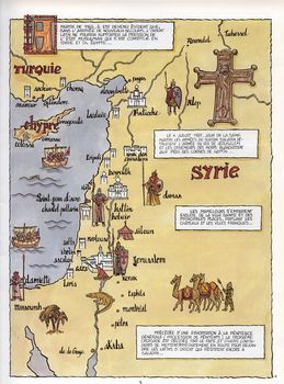 remarques: | début de croisade pour Richard Ier et Philippe-Auguste qui est en fait Philippe II, mais aussi début des luttes intestines entre croisés à l'avantage de Saladin, l'arrivée de Richard et de ses troupes apportent toutefois un nouvel élan pour l'offensive des croisés l'arrogance de Richard contraste avec les lamentations de Philippe II >> p. 8 le repas des rois >> p. 12/13 la destruction du beffroi lors d'un raid sur le camp des croisés, Bertran est fait prisonnier par Saladin, il devient un ami de Saladin et s'enthousiasme de la civilisation arabe les rois deviennent malades, mais la position de Saladin ne s'améliore pas pour autant, défaite des sarasins et prise de St-Jean-d'Acre, début des négotiations avec Saladin qui admire Richard (le lion), mais qui méprise Philippe (le chien), les sarasins font des éloges à Richard et Philippe-Auguste se fâche, il rembarque pour la France alors que Richard se querelle avec le duc d'Autriche (ce qui lui coûtera cher par la suite!) Bertran, l'empereur du dernier jour, retrouve sa liberté et Richard (le roi) se retrouve seul façe à Saladin >> p. 38 ils sont fous, ces roumis >> p. 40 le croissant vert (genre de croix rouge arabe) >> p. 41 l'ignorance des hommes >> p. 42 mais Bertrand a la connaissance de Dieu ce qui n'est accordée qu'à un très petit nombre (une minorité parmi les hommes) >> combats et intrigues de Richard Coeur-de-Lion avec Philippe-Auguste contre le sultan Saladin et son frère Malik et une très belle fresque historique sur les croisades par Boubé et Cothias, le meilleur album de la série avec le tome 4 (à comparer avec l'album "la croix et le croissant" par Funcken) |