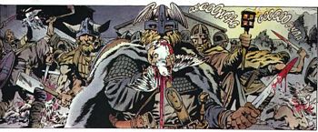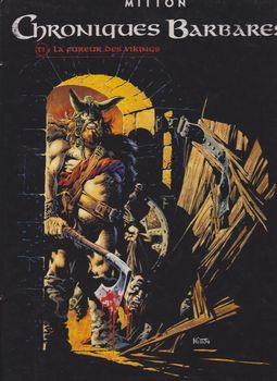 remarques: | de sa retraite en Amérique du Nord, un vieux moine, avec son épouse indienne Tseha-Tahe, raconte sa vie et ses terribles souvenirs quand en 911, les féroces vikings attaquèrent le monastère bénédictin de Saint-Joseph du Havre dans l'estuaire de la Seine, il était alors Bartholomé, un novice moinillon qui avait été recueilli en son temps par le prieur de l'ordre, le père Guillaume >> p. 13 le martyr de père Guillaume réfugié dans les latrines, Bartholomé échappe aux vikings et réussit à s'enfuir >> p. 22 dans la ville fortifiée de Rouen >> p. 26 le prophète qui avertit la populace que les vikings sont l'instrument de Dieu pour les punir de leurs péchés gouverné par le prévôt Rotomagus, la ville tombe et le jeune prince viking, Leif Eriksonn vient reprendre et se venger sur Hilde de Trondheim, son épouse envolée et passée chez Rotamagus, mais Bartholomé, le moinillon, réfugié près de la princesse, prépare au prince une drogue qui le met hors d'état de nuire et ce sera le moinillon qui affublé du masque et des vêtements du prince sauvera sa vie et celle de Hilde en se faisant passer pour le prince viking >> p. 40 la belle Hilde dont le sexe est fermé par une serrure le mot de Bartholomé: "puissent mes trois chroniques témoigner de la fureur viking, puissent-elles de même révéler par quel fol destin et en quelle cruelle odyssée, moi, Bartholomé, petit frère bénédictin, orphelin par devant les hommes et pécheur par devant Dieu, je me noyai sans retour dedans le flot barbare afin de mieux le détourner jusqu'en mon lointain exil" >> le scénario ne vaut pas grand chose, même vulgaire, mais le graphisme est bien mitonné à noter aussi la narration en un drôle d'allemand: focke Hilde! INFORMATION Chroniques barbares de Jean-Yves Mitton (Soleil Production, 1994 – 2000) Mitton a fait plusieurs séries, toutes avec un cadre historique très marqué ses bandes dessinées sont destinées à un public adulte à cause de la violence et des scènes à caractères sexuels qu’il illustre Chroniques barbares nous raconte en six tomes, l’histoire d’un jeune moine bénédictin, Bartholomé et d’un jeune chef viking Leif Erikson qui se ressemblent comme deux gouttes d’eau; nous sommes en 910, Bartholomé, pour sauver sa vie au moment de l’invasion barbare menée en France par Leif, se fait passer pour le jeune viking, qu’il laisse pour mort… Mitton fait dans l’épique, il place son scénario dans un cadre historique grandiose et décadent, de violences et de conquêtes, il mène admirablement bien son histoire, tout parait plausible: les guerres, les alliances françaises-vikings, les shamans, les sacrifices humains, on suit tout d’abord Bartholomé pendant trois tomes, puis Leif, qui ayant perdu la mémoire, a finalement pris la place du jeune bénédictin avec Bartholomé, Mitton nous montre les réactions et états d’âme d’un jeune homme qui n’était pas fait pour gouverner et qui se retrouve à la tête d’un empire barbare comme pas deux, il passe son temps entre sexe (qu’il vient de découvrir), et combat pour interdire les rites religieux sanguinolents et pour mettre en place une alliance entre la France, son pays d’origine, et l’empire barbare qu’il dirige avec Leif, on suit un jeune homme en quête de sa mémoire et de son passé qui va rapidement redevenir le meneur violent et cruel qu’il était, son but étant de reconquérir son trône… Mitton a un dessin très noir, qui fait un peu vieillot sur les bords, mais qui nous plonge irrémédiablement et instantanément dans son histoire, il y a un véritable travail de reconstitution pour les décors mais aussi pour les vêtements, les armes et les bijoux de ses personnages qui sont toujours très travaillés, très soignés il utilise partout un trait noir assez gros pour les contours, ce qui donne au dessin une très forte intensité Mitton aime peindre les corps, et ça se voit, qu’il dessine un homme, une femme, un enfant, un gros, un maigre, ou un musclé, les anatomies de ses personnages sont toujours parfaitement proportionnées et bien détaillées il a tendance à représenter ses personnages féminins avec de poitrines généreuses et il les dénude peut être un peu trop souvent… fresque historique grandiose, guerres, conquêtes, violence aveugle ou barbare, pouvoir, sexe et finalement morale et rédemption, Mitton a tout compris dans le même genre, Mitton a fait trois séries principales sur fonds historiques: - Vae Victis (qui se déroule en Gaule sous l’Empire romain) - les survivants de l’Atlantique (en France et dans les îles, au moment de la révolution française avec aventures maritimes, piraterie, trésors et traite des noirs) - Quetzalcóatl (du nom du Dieu serpent aztèque, se déroulant au Mexique dans les années 1525 avec les conquistadors de Cortès) |